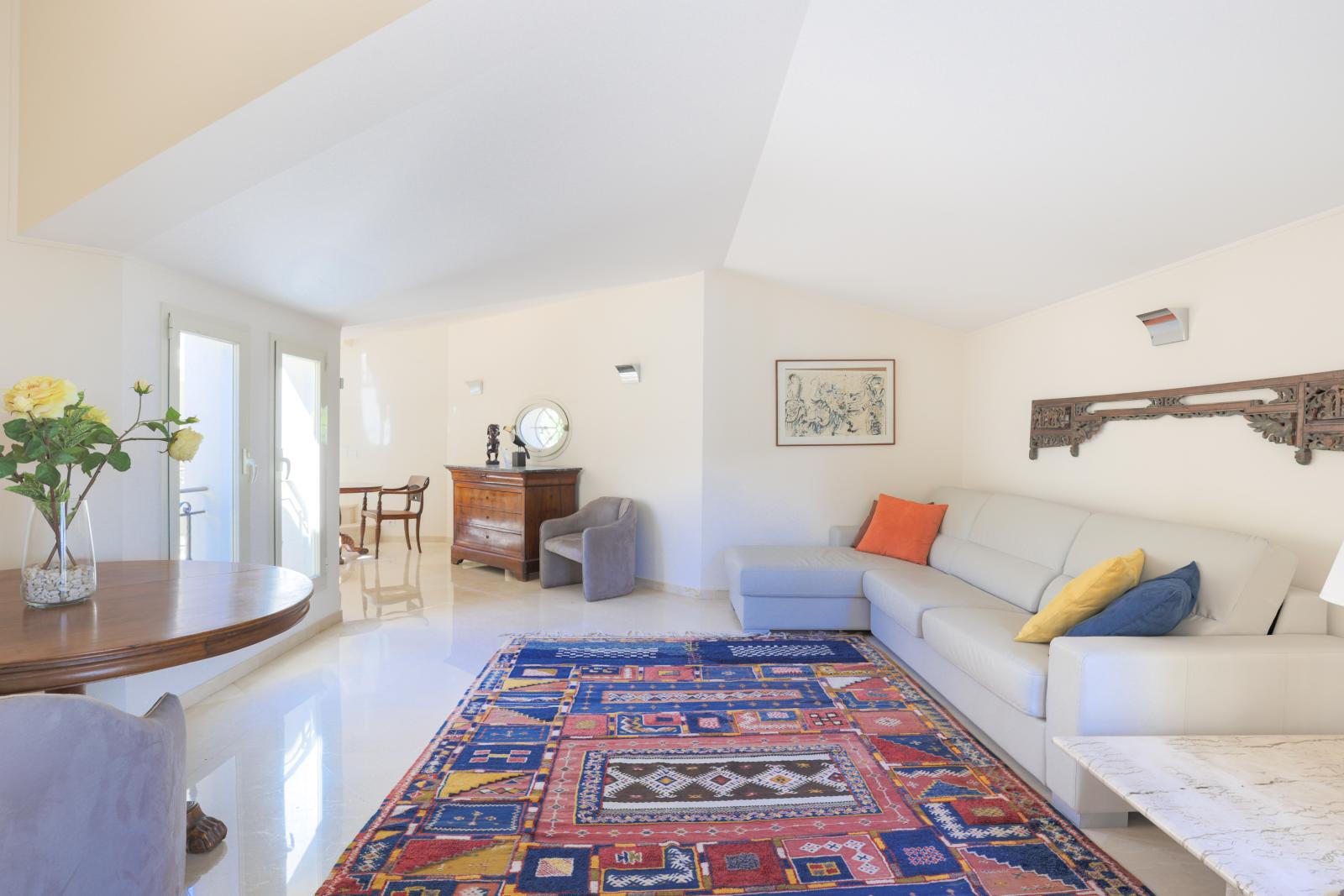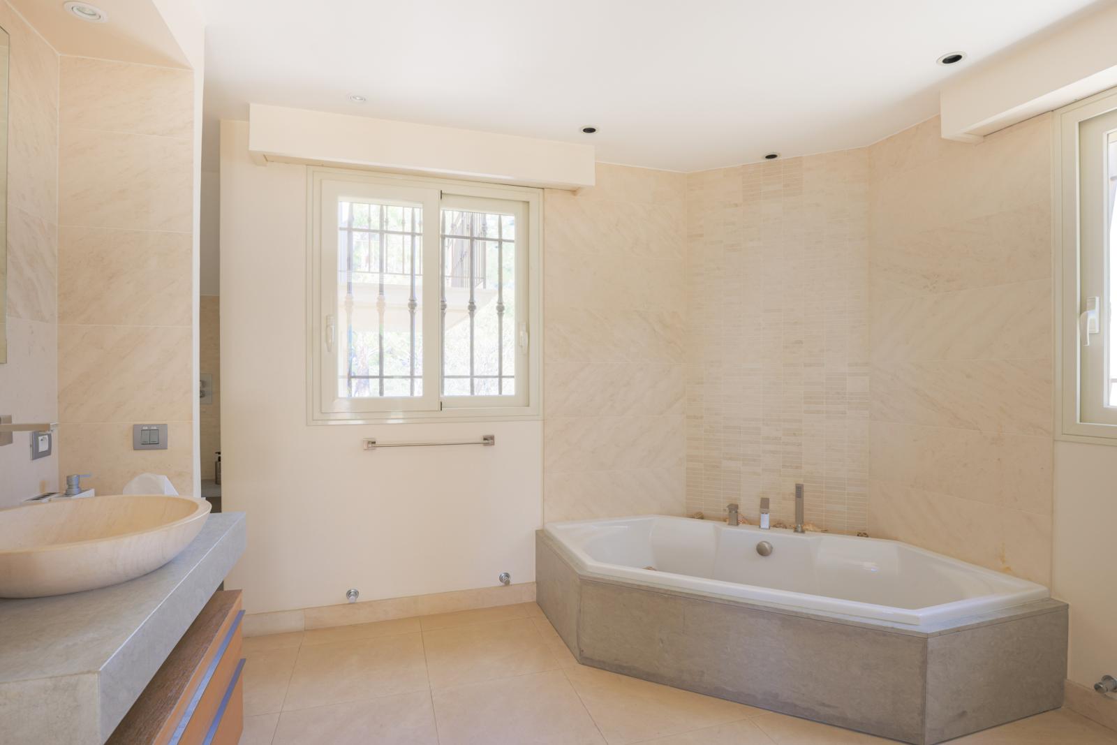 Le vaste jardin paysagé entoure la propriété et profite d'un large jacuzzi avec vue mer.