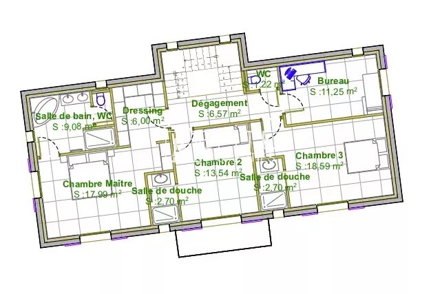 4 chambres dont une chambre parentale avec salle de bains/WC + dressing, 2 autres salles de douche et un toilette indépendant.