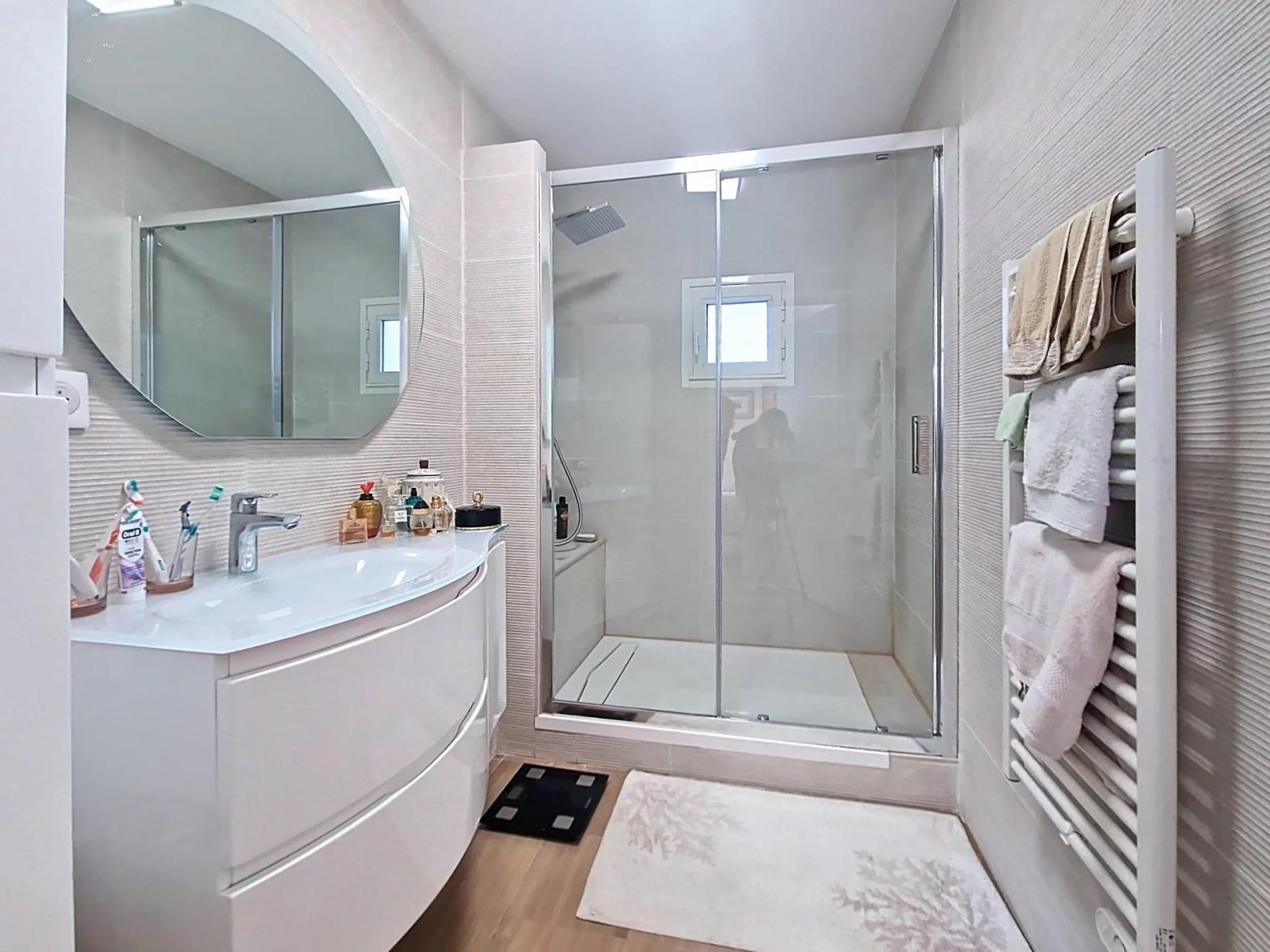 L’espace nuit offre une suite parentale avec accès direct à la terrasse, ainsi qu’une seconde chambre disposant de sa propre salle d’eau, également ouverte sur la terrasse exposée plein sud. Un WC indépendant avec placard buanderie complète cet agencement parfaitement maîtrisé.