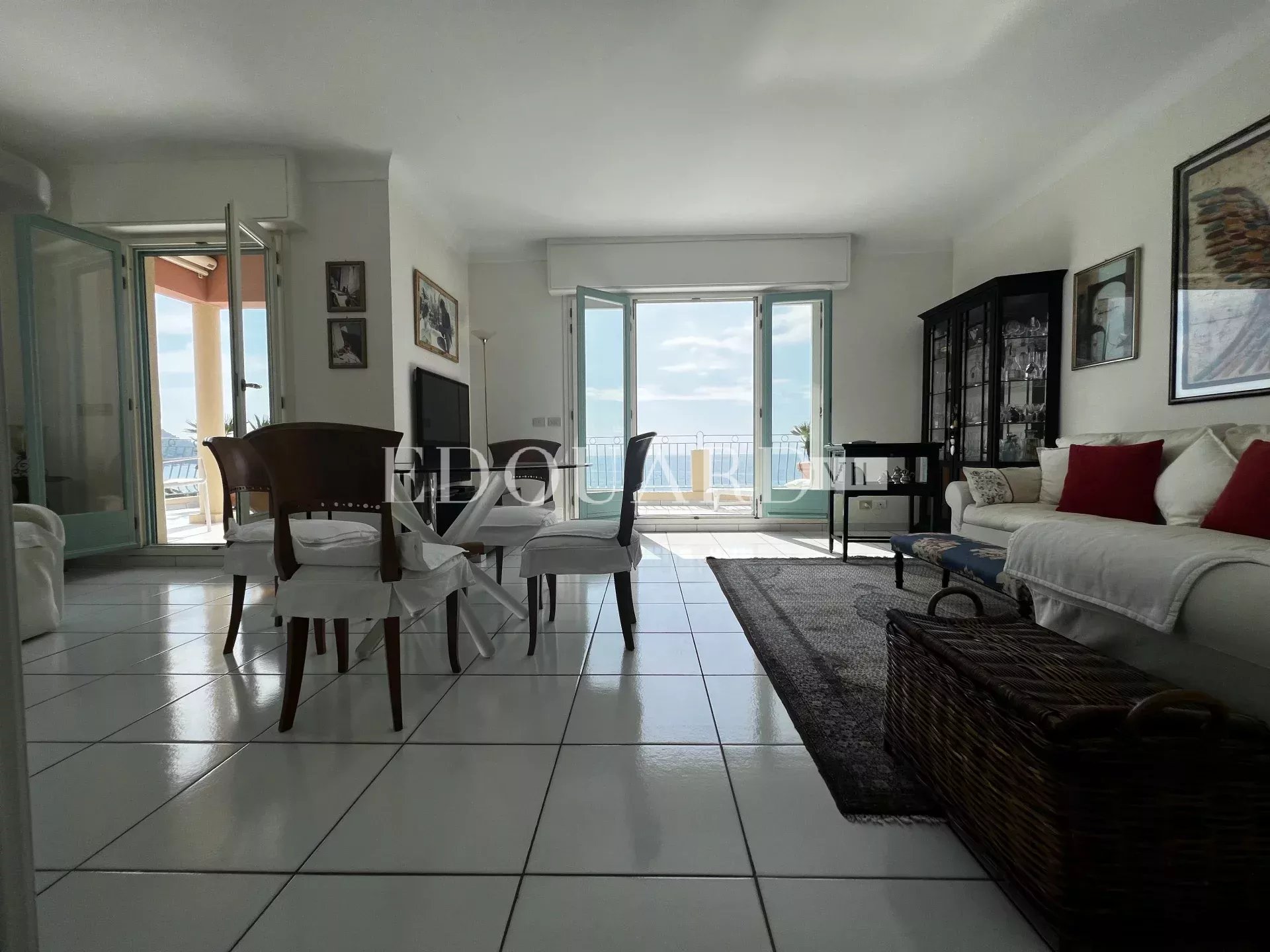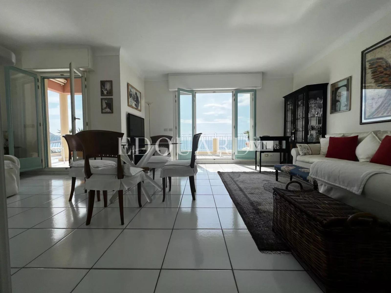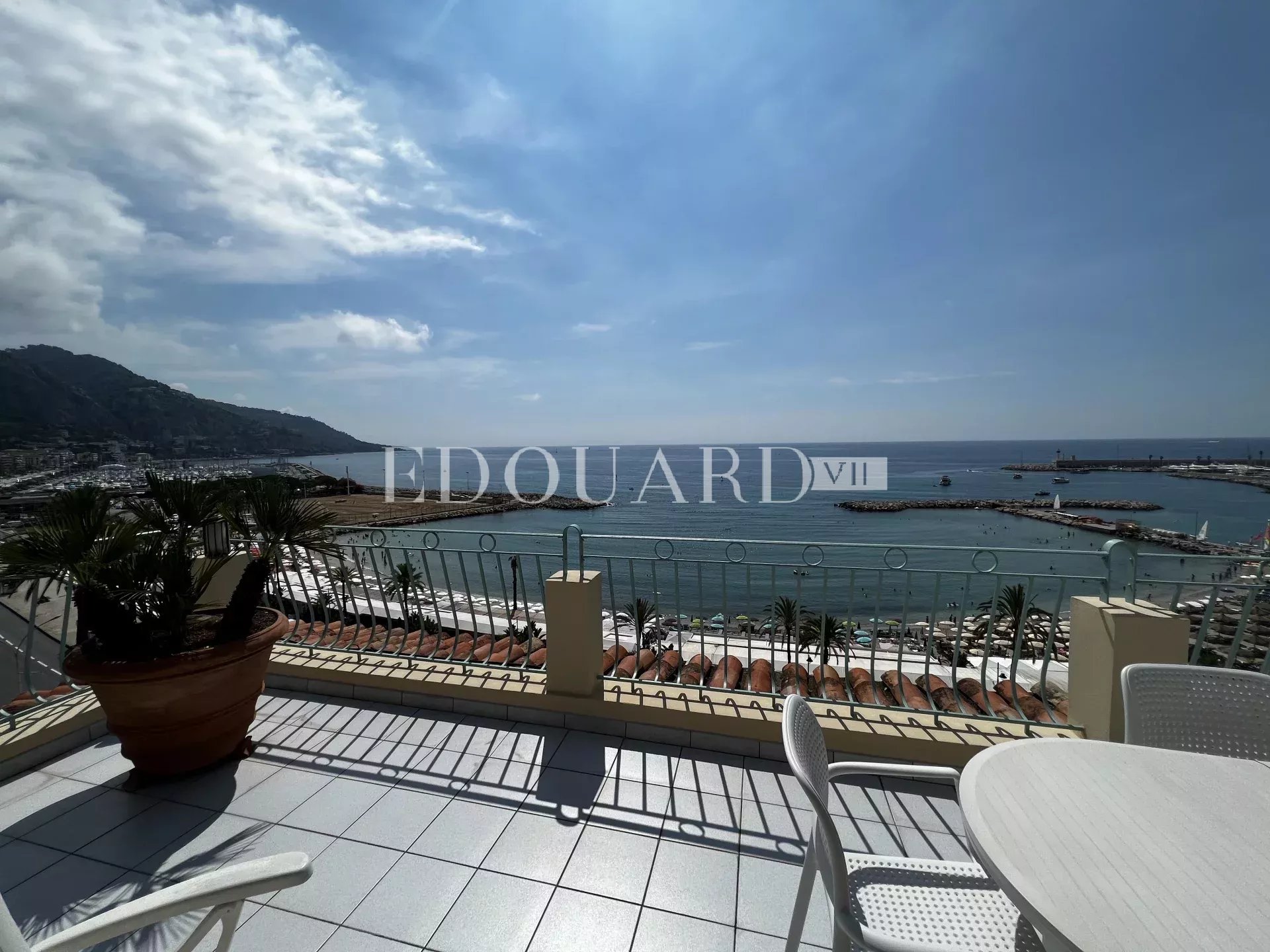 Grand deux pièces à vendre sur la commune de Menton, au cœur du renommé quartier résidentiel de Garavan, à quelques pas des commerces, des plages et du porte de plaisance. Au cinquième et dernier étage d’un splendide immeuble d’époque, magnifique penthouse de 76 m² en excellent état avec porte blindée, vidéophone, double vitrage, volets roulants et stores électriques. Composé d’entrée avec placard, séjour très lumineux, salle à manger, cuisine indépendante complètement équipée, chambre à coucher, dressing, spacieuse salle de douche avec bidet et fenêtre, 44 m² de spectaculaire terrasse avec jolie loggia et superbe vue mer panoramique, possibilité cave et garage. Idéalement exposé Sud-Est et très ensoleillé, produit exceptionnel.