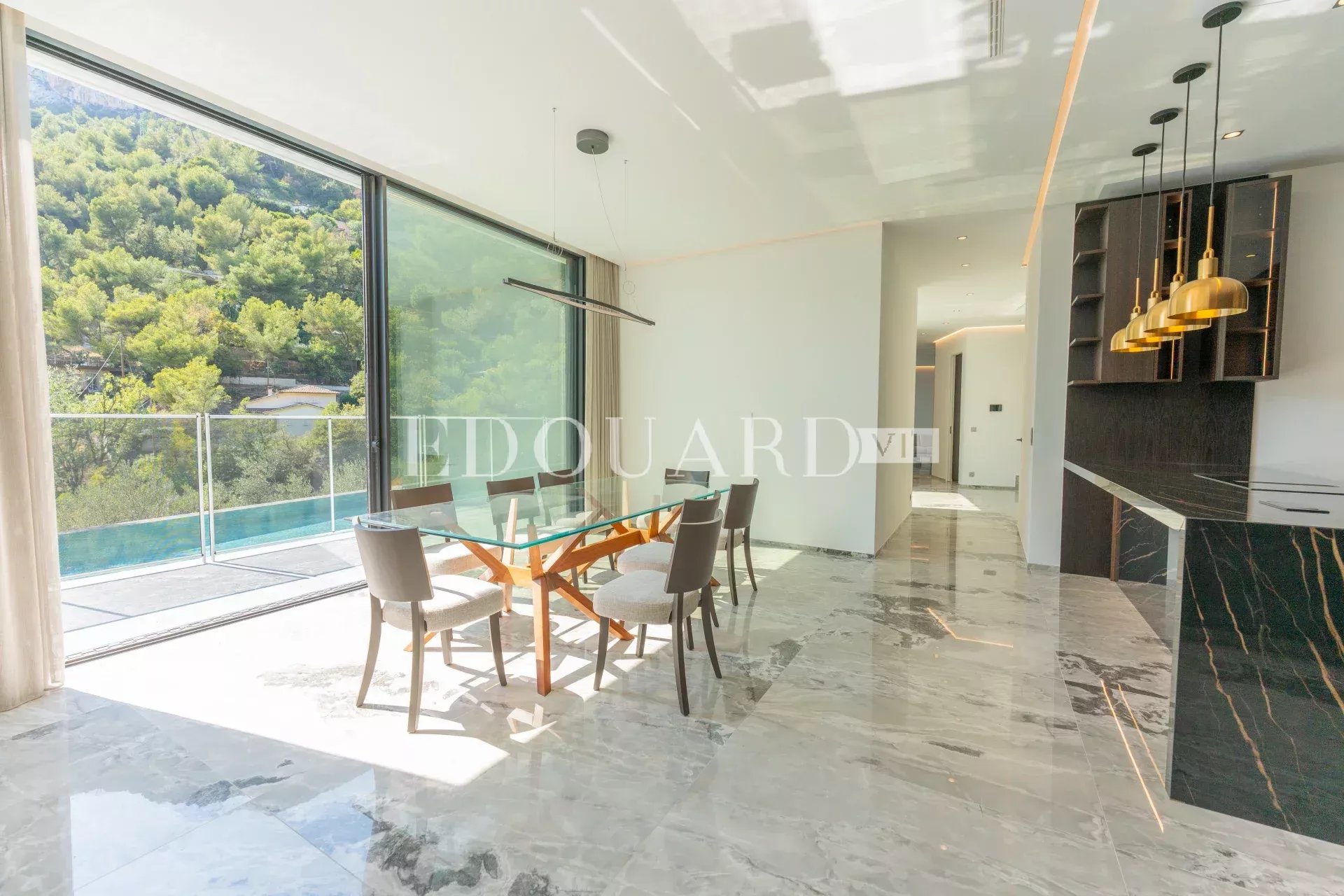 Sur la commune de Roquebrune Cap Martin, dans un quartier résidentiel proche de la Principauté de Monaco, à vendre en exclusivité villa neuve de 315 m² avec domotique, alarme, vidéosurveillance, porte blindée, climatisation réversible, chauffage au sol, ascenseur, escalier intérieur, piscine à débordement, jardin et belle vue mer panoramique. Construite sur 2.371 m² de terrain, cette splendide propriété se compose au niveau inférieur de spacieuse entrée, dressing, WC pour les invités, grand séjour très lumineux, salle à manger, cuisine indépendante complètement équipée, salle de sport, chambre avec dressing, salle de bains et WC séparé, buanderie, 121 m² de terrasse ; au niveau intermédiaire bureau, chambre de maître avec grand dressing, salle de bains, salle de douche et WC séparé, 2 chambres avec placards et salles de douche intégrées, 44 m² de terrasse ; au niveau supérieur 4 parkings couverts avec accès direct. Idéalement exposé Ouest et très ensoleillée, entouré de verdure et au calme absolu, produit excellent.