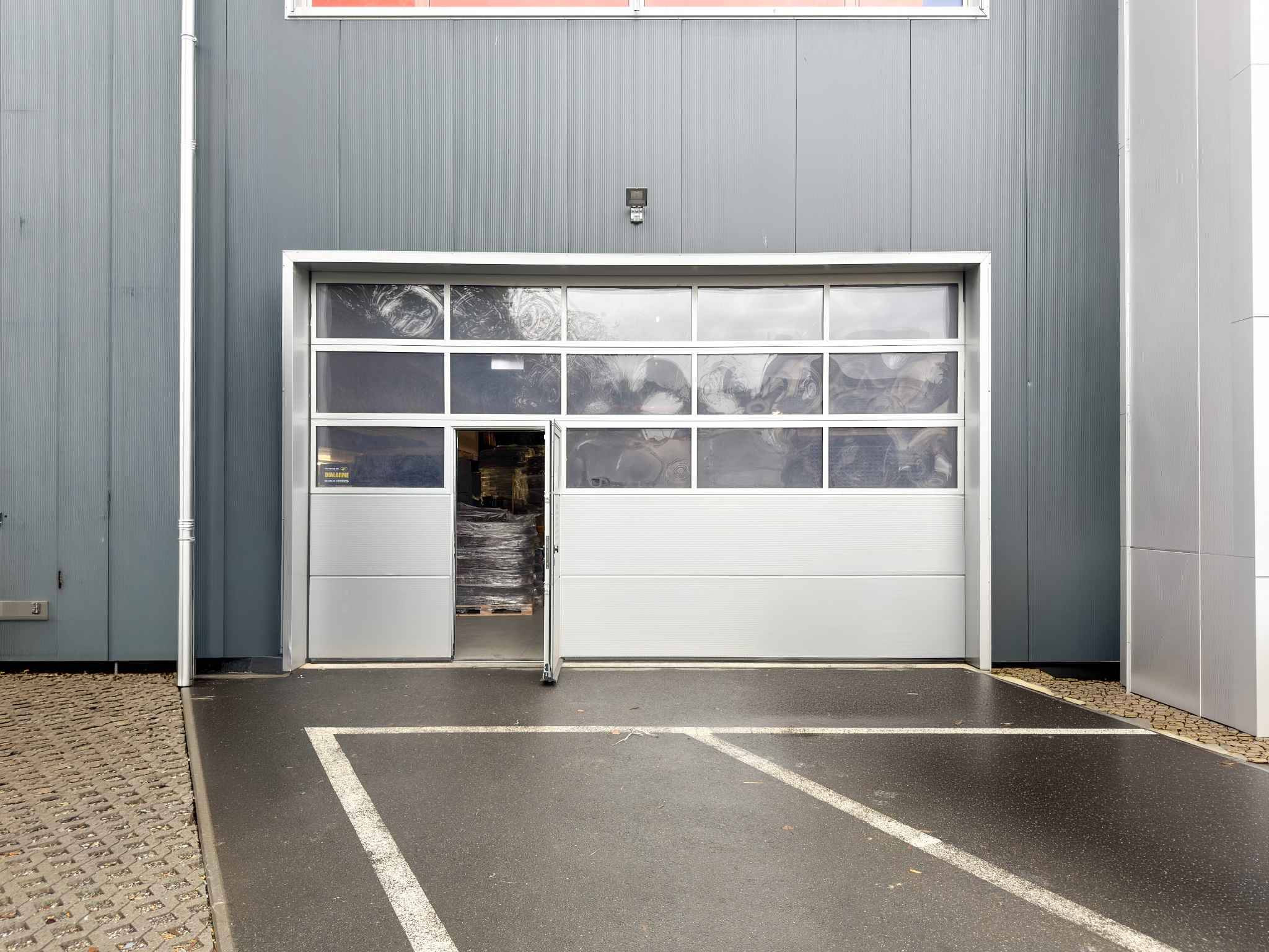 L’atelier dispose d’une porte sectionnelle, facilitant la circulation des marchandises et l’accès des véhicules utilitaires.