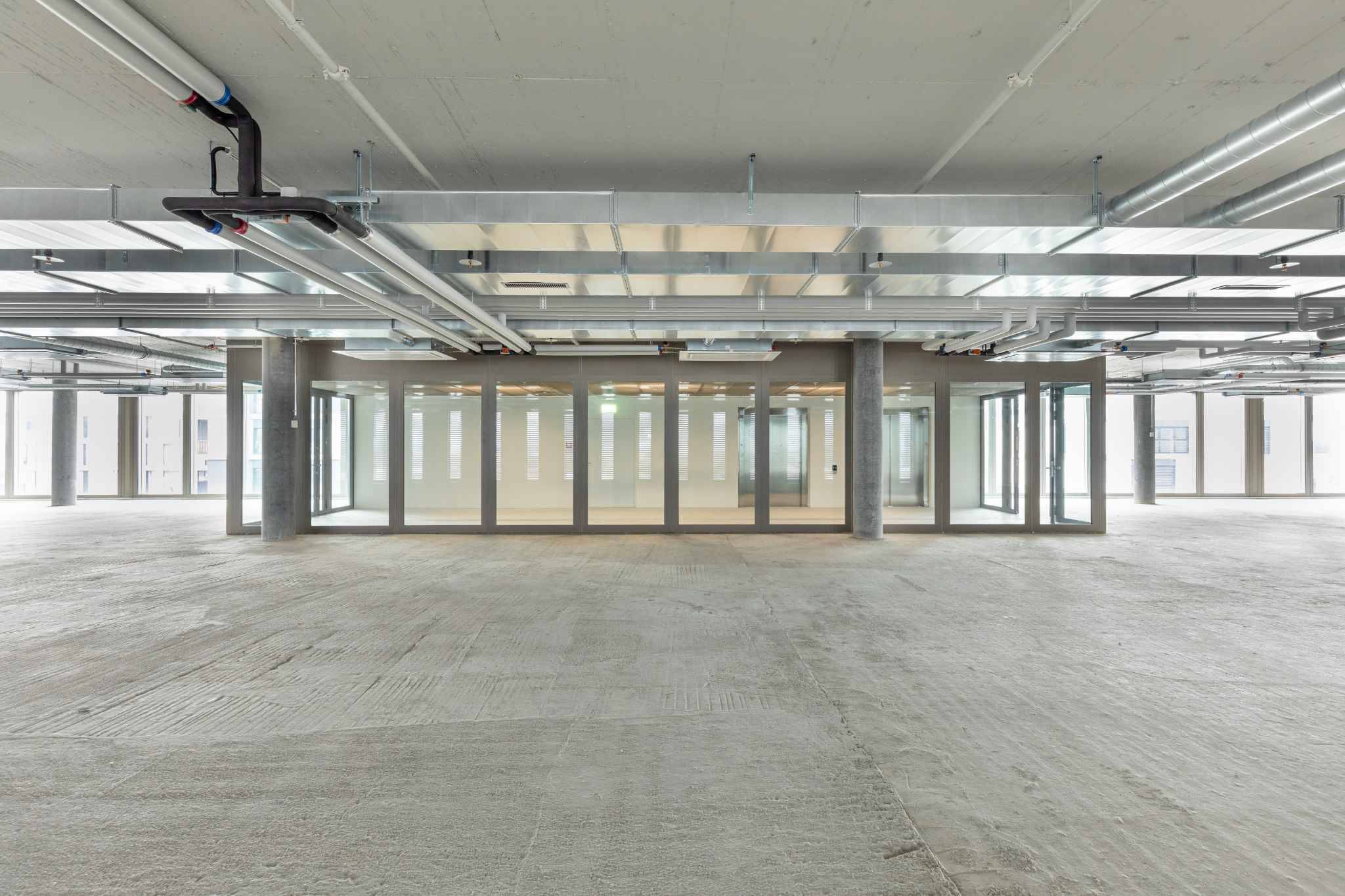 Découvrez ces bureaux bruts situés au 4ᵉ étage d’un bâtiment moderne et fonctionnel, au cœur du Quartier de l’Étang à Genève.