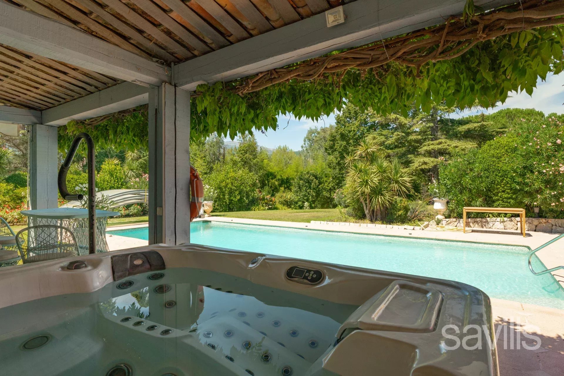 Le terrain paysager d'environ 5 337 m² bénéficie d'une totale intimité et comprend une grande piscine, un pool house avec cuisine, un jacuzzi et une terrasse couverte. Deux étangs avec des nénuphars en abondance, un ruisseau décoratif et une cascade complètent ce jardin bucolique.