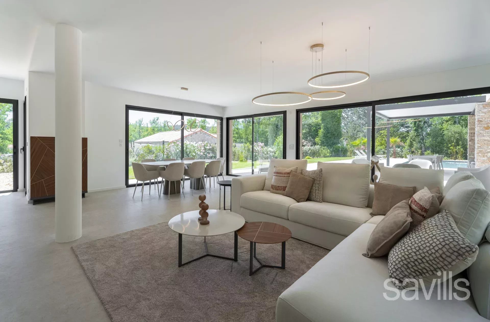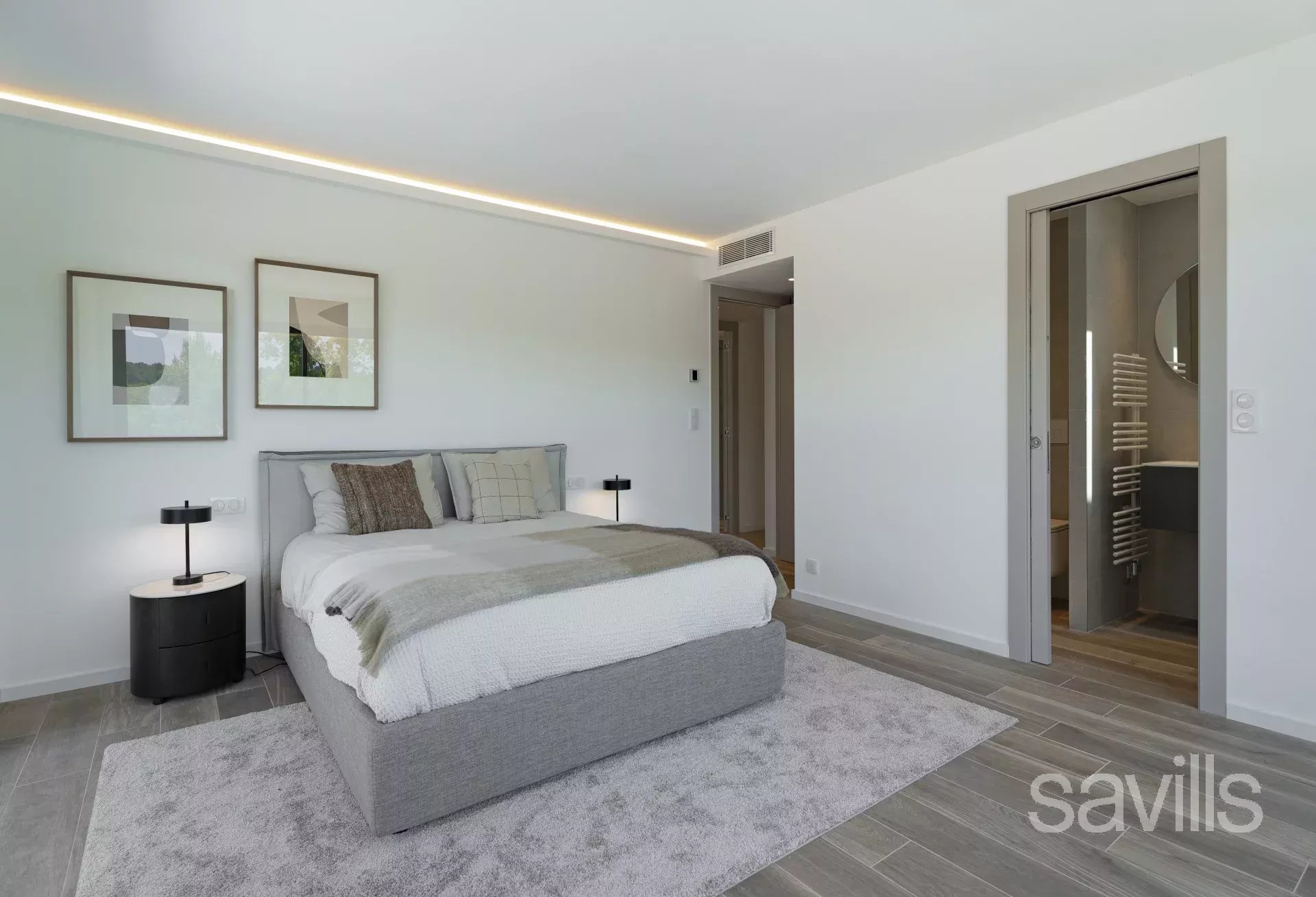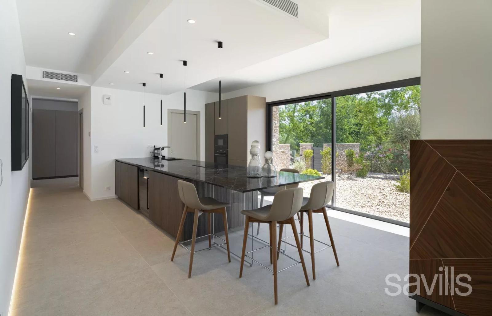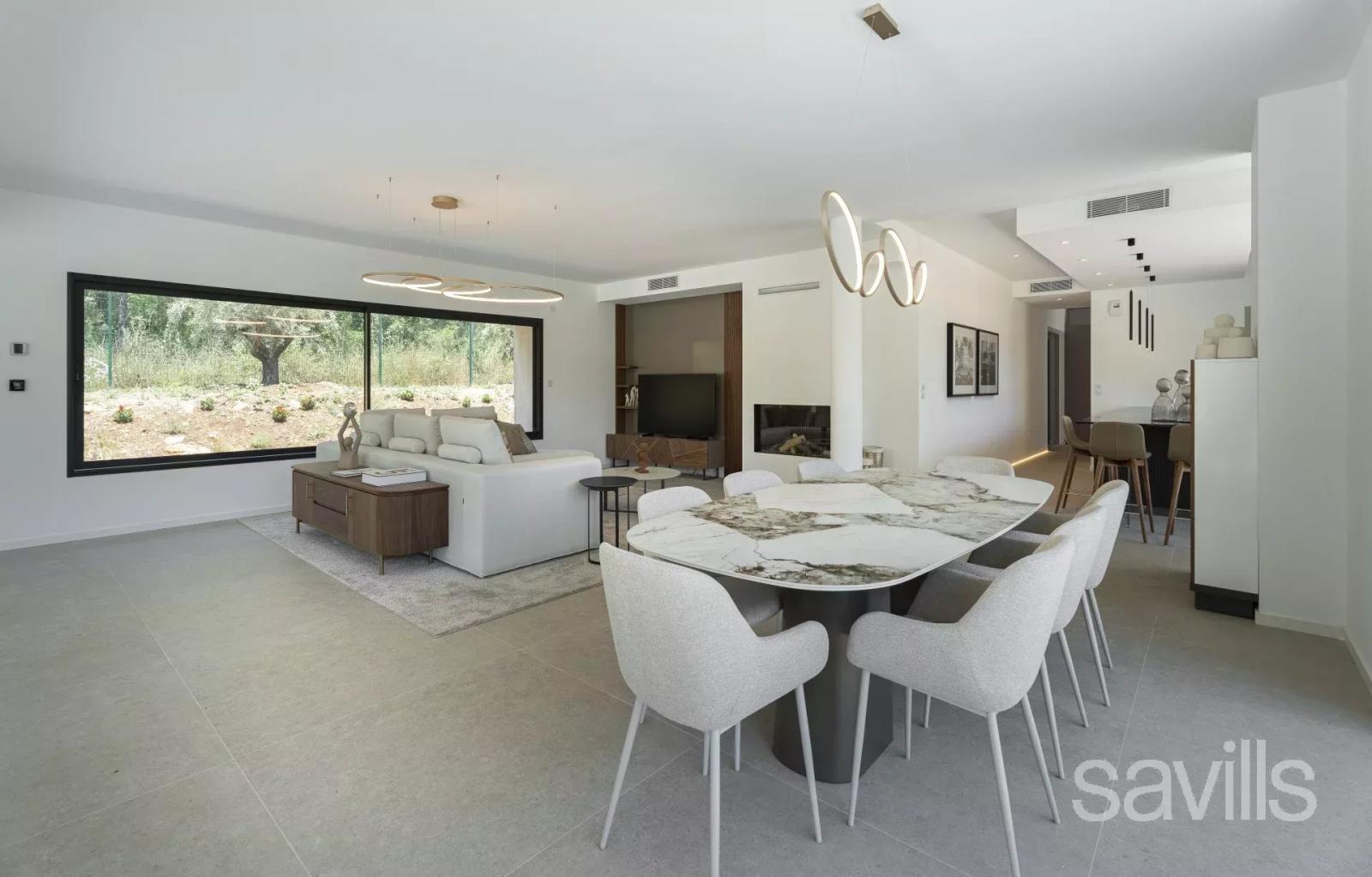 La pièce de vie principale, baignée de lumière, s’articule autour d’une salle de réception avec cheminée au gaz et d’une cuisine ouverte équipée dans un esprit contemporain. La suite principale, située au rez-de-chaussée, dispose d’un dressing et d’une salle de bains raffinée. À l’étage, trois chambres en suite offrent à leurs occupants confort et intimité.