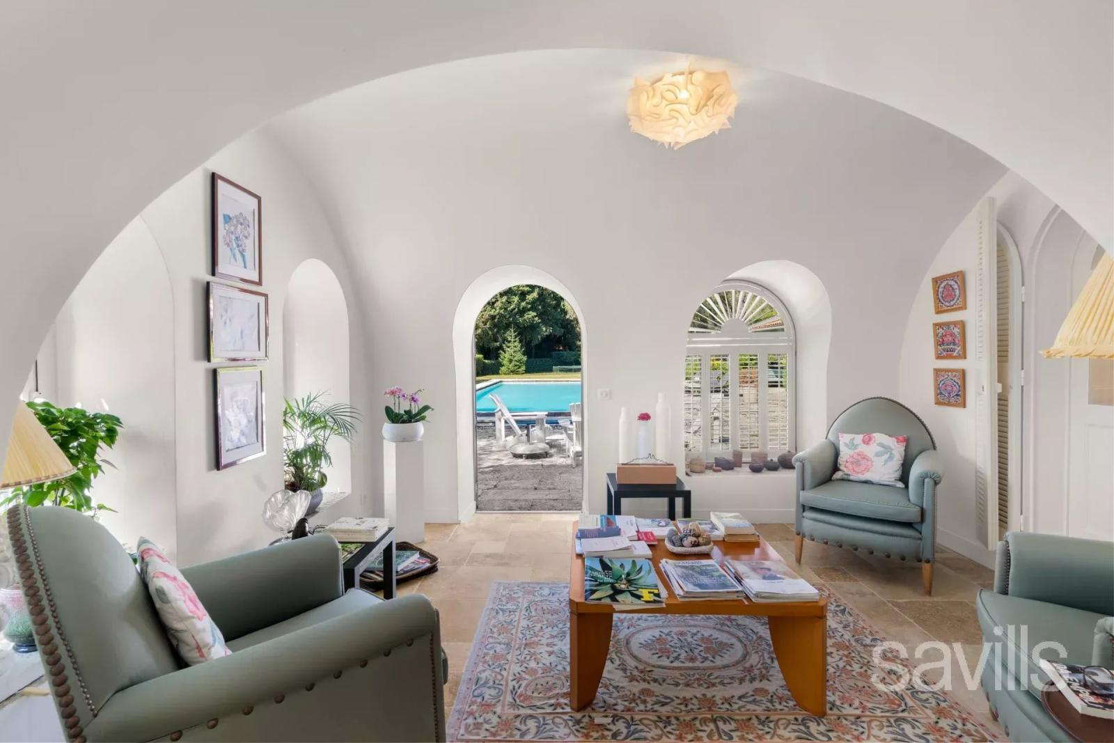 Les annexes comprennent une maison de gardien indépendante de 100 m², un double garage et une dépendance avec chambre d’ami et buanderie.
