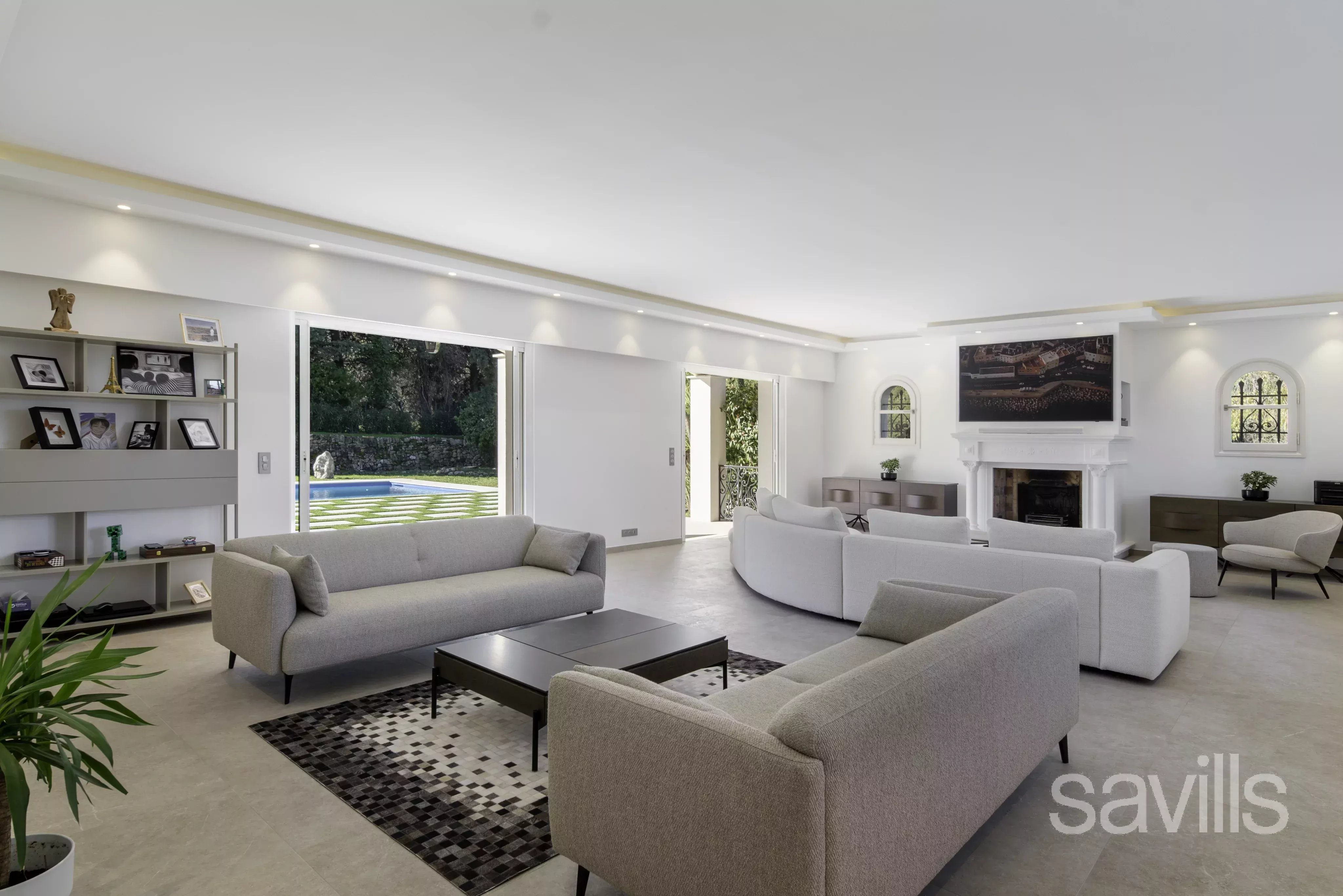 L’entrée raffinée conduit à un vaste séjour lumineux composé de plusieurs espaces salon, tandis que de larges baies vitrées assurent une parfaite continuité entre intérieur et extérieur, donnant directement sur l’espace piscine sans aucun vis-à-vis.