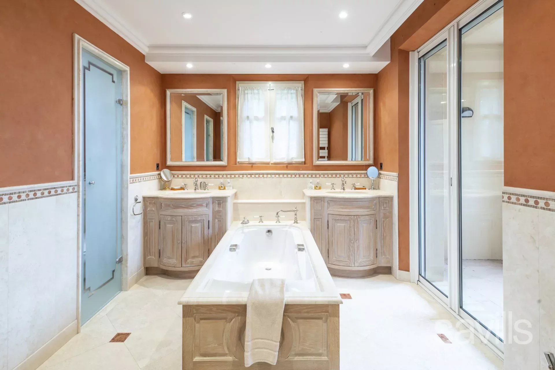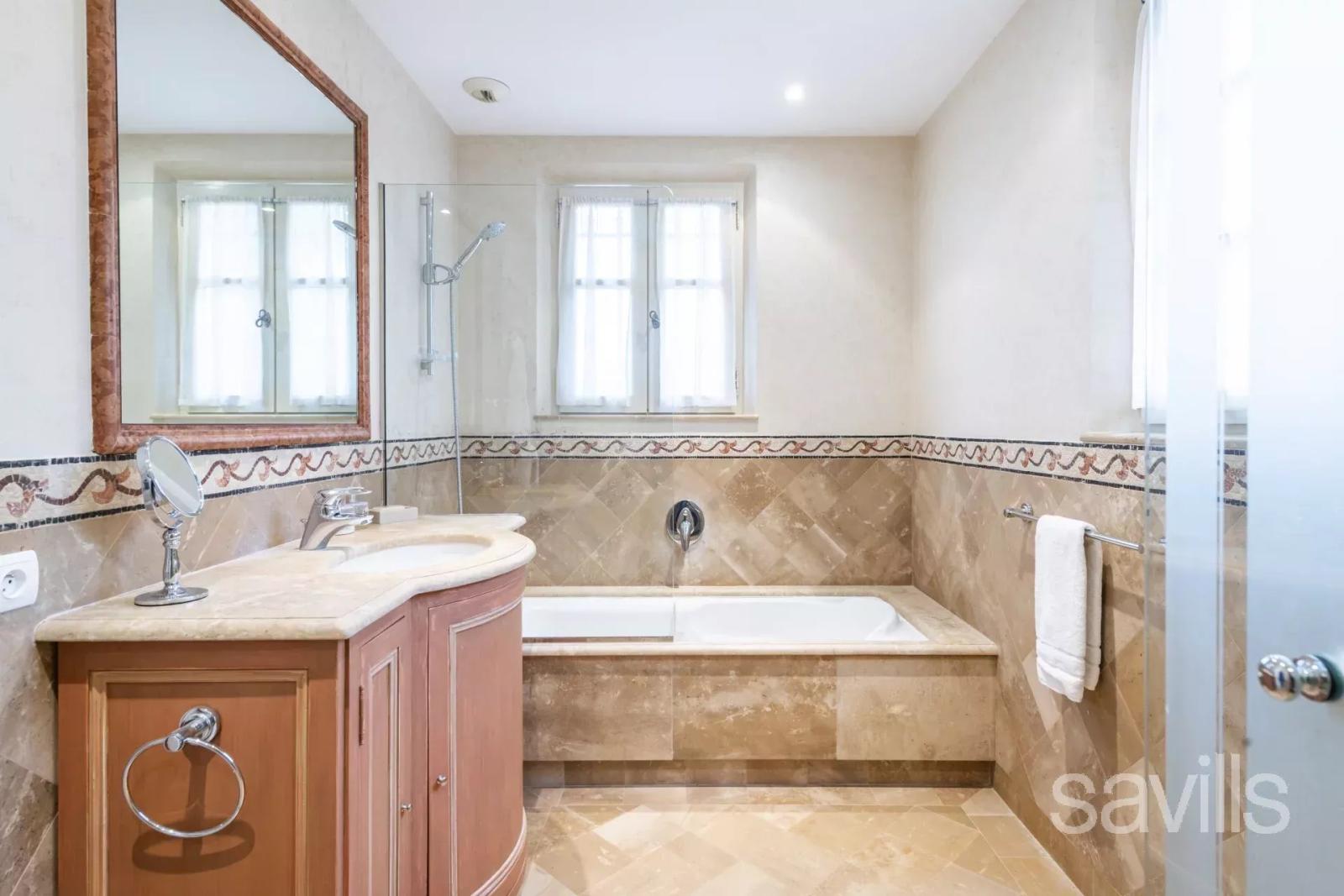 Au rez-de-chaussée : un hall d'entrée, un salon, une salle à manger, une cuisine entièrement équipée avec cellier et coin repas, une deuxième pièce de réception avec cheminée, ainsi que deux chambres, chacune avec sa salle de bains privative.