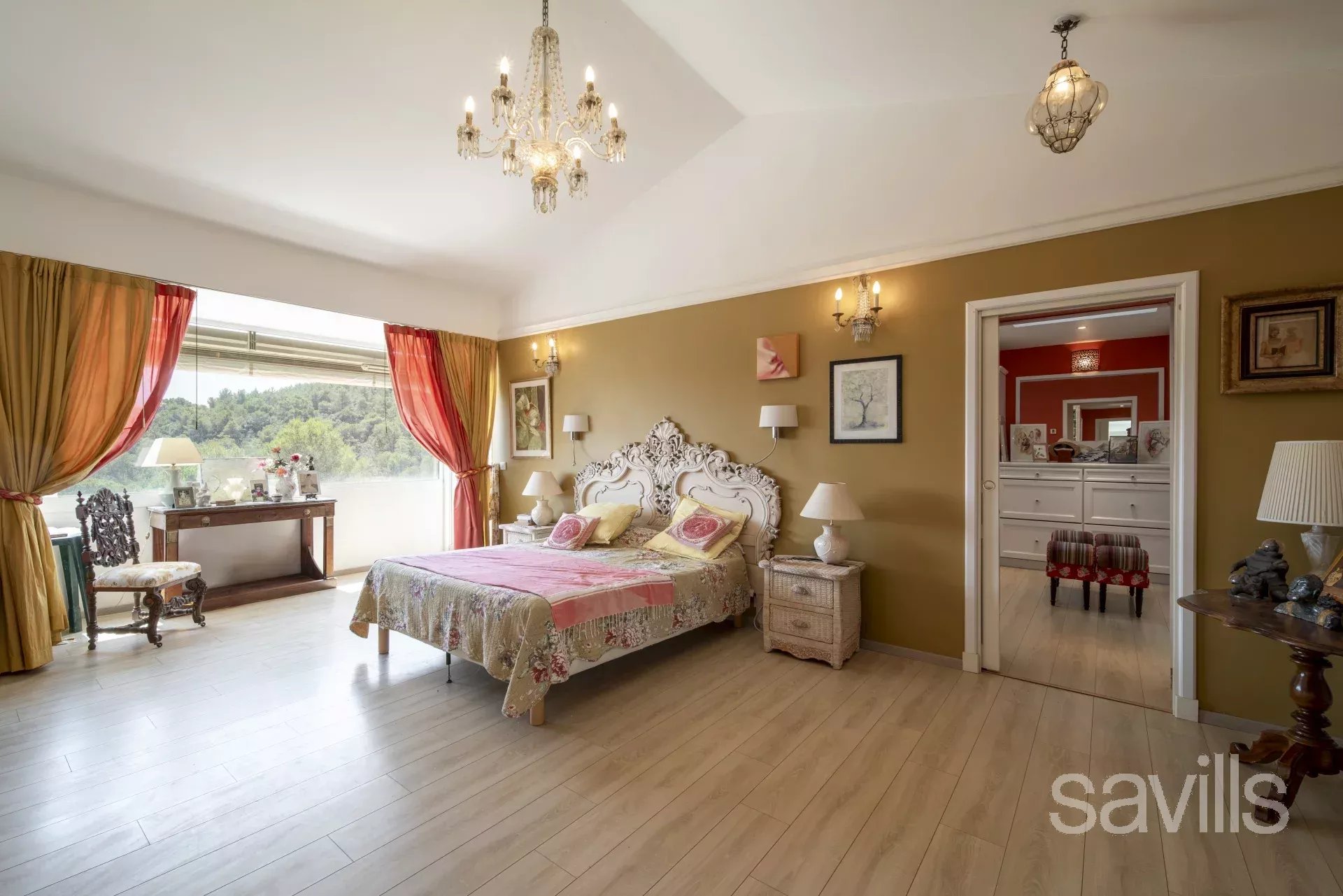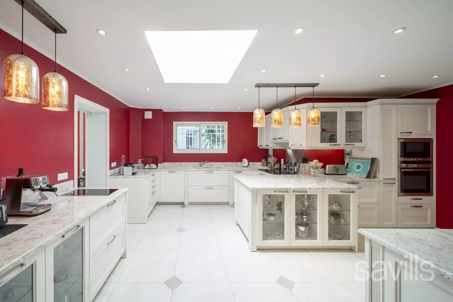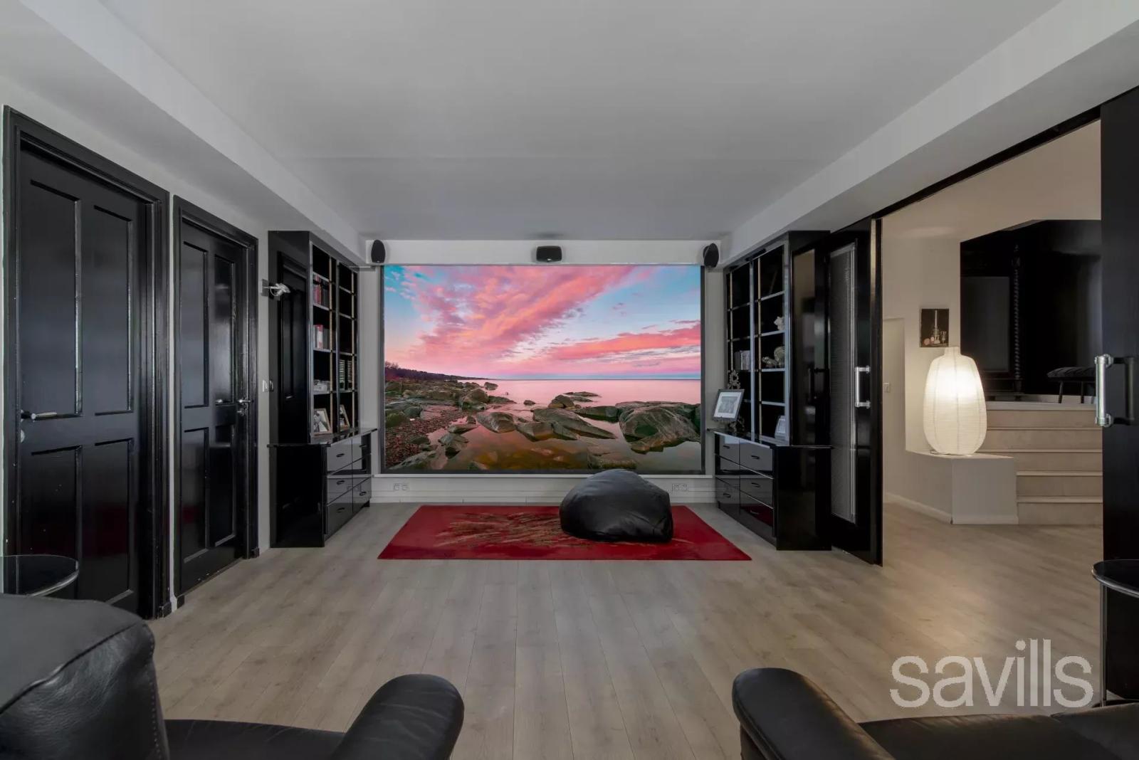 La villa dispose de six chambres avec salles de bains attenantes, sauna, hammam, salle de sport, salle de cinéma et grand bureau.