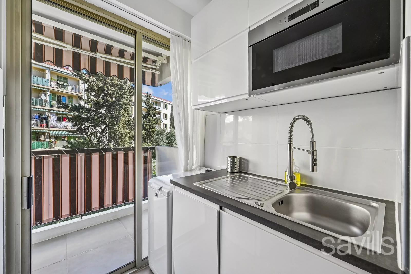 La cuisine ouverte, moderne et entièrement équipée, dispose également d’un balcon.
