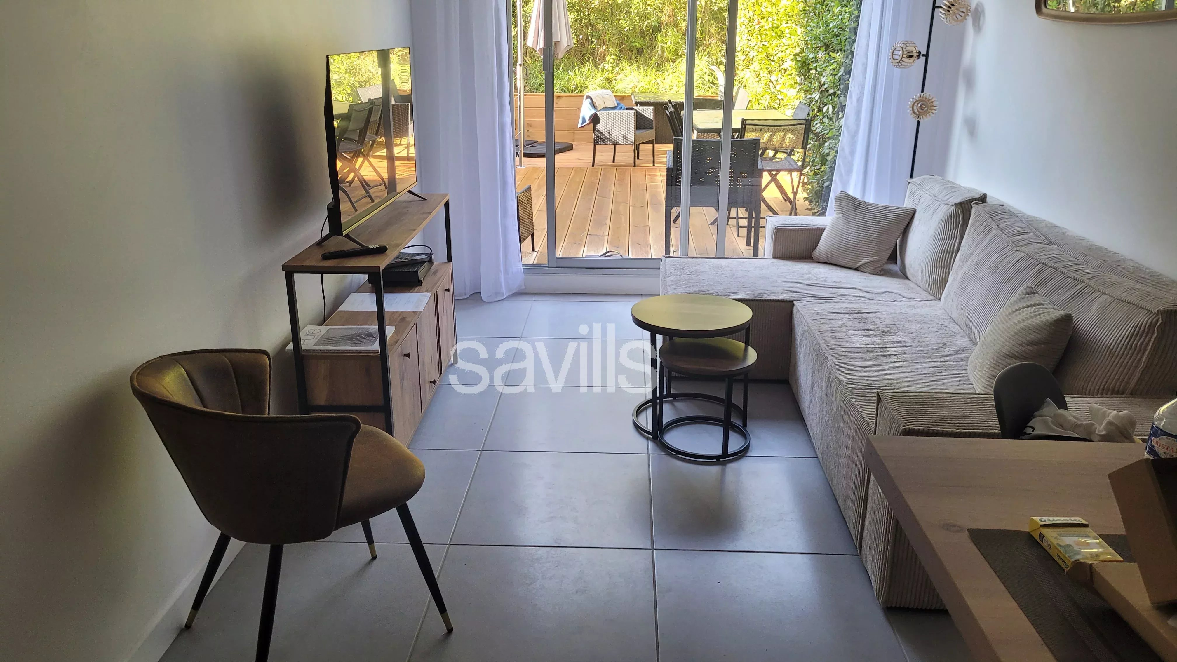 La terrasse, véritable espace de vie extérieur, est aménagée avec un coin repas, un salon de jardin, des transats et de nombreux espaces de rangement. Une large banne électrique protège du soleil, et la haie végétalisée offre un cadre verdoyant et intimiste, idéal pour savourer l’art de vivre tropézien.