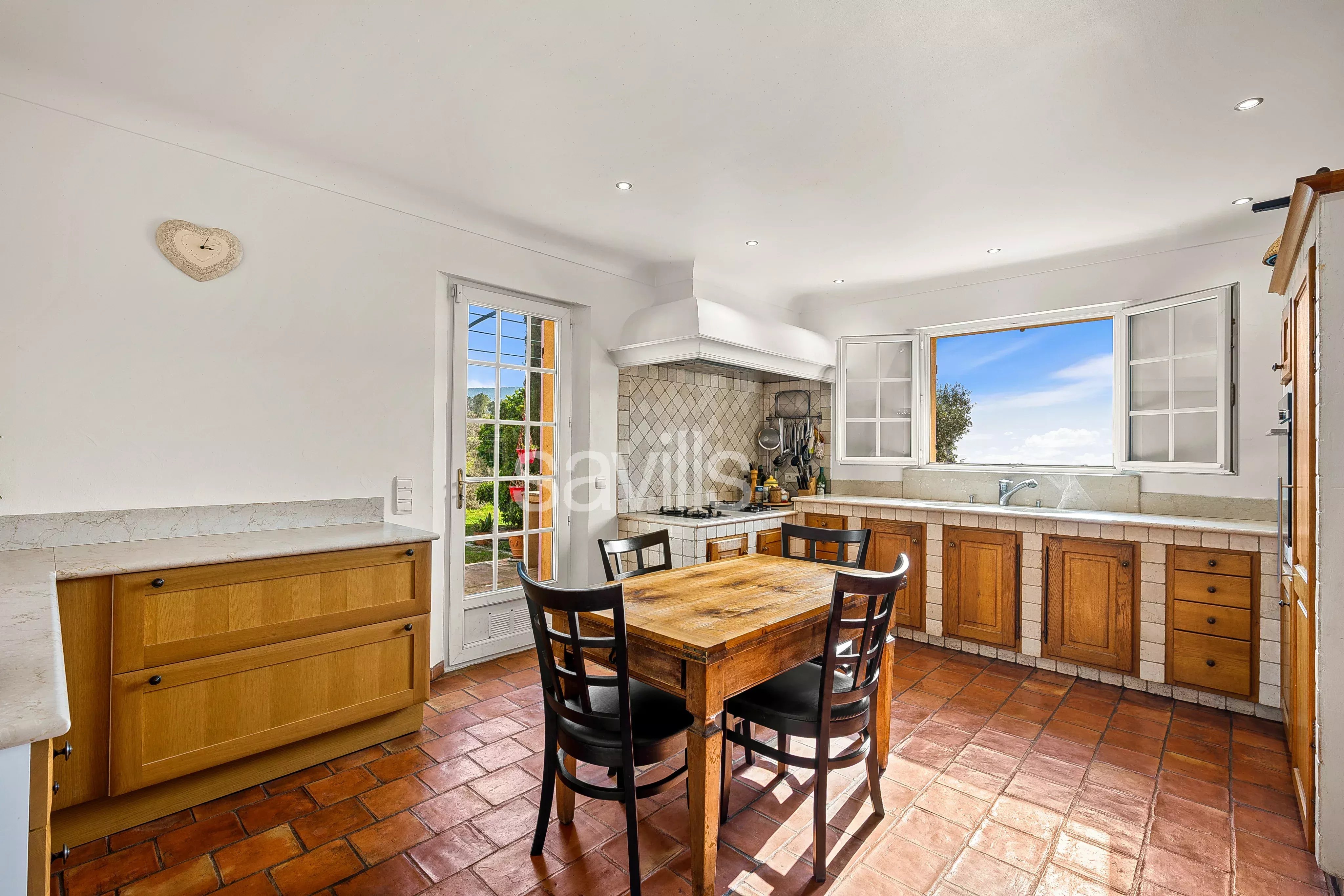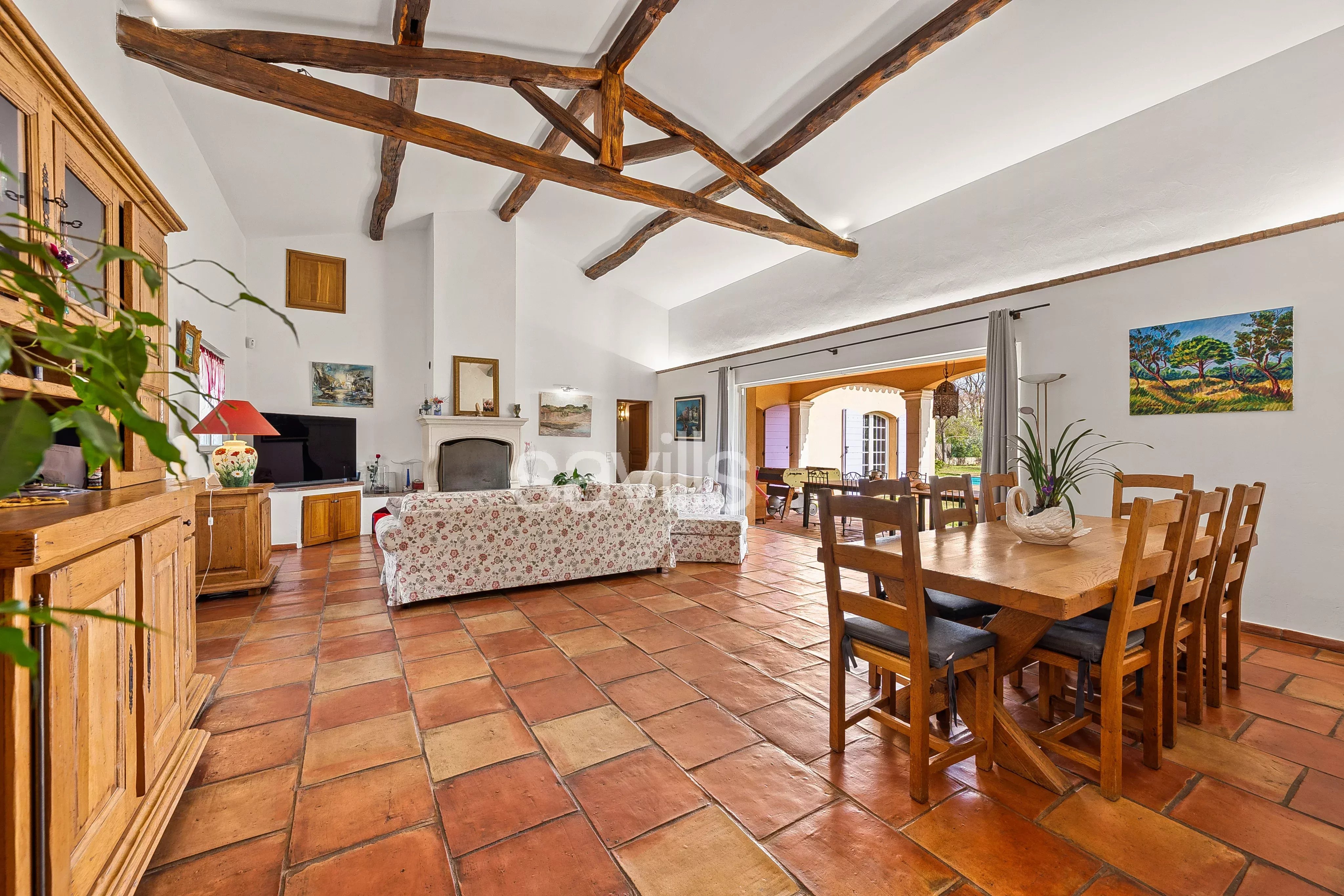 Offrant une vue dégagée sur la campagne, la villa de plain-pied se compose d’une entrée, d’un bureau, d’un séjour idéal pour recevoir avec près de 55 m², cheminée et plafond cathédrale avec charpente apparente, d’une cuisine entièrement équipée ainsi que d’une arrière-cuisine.