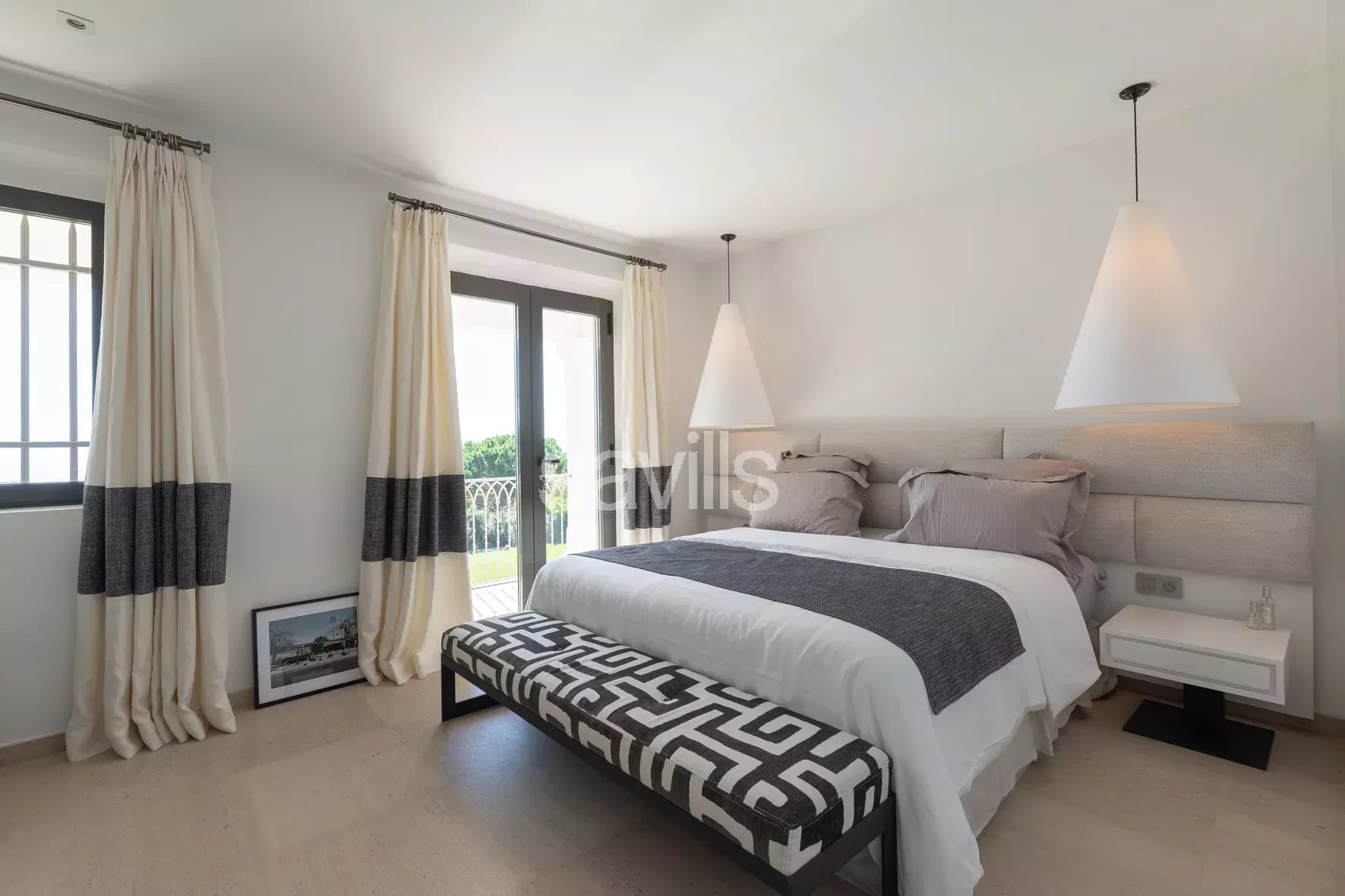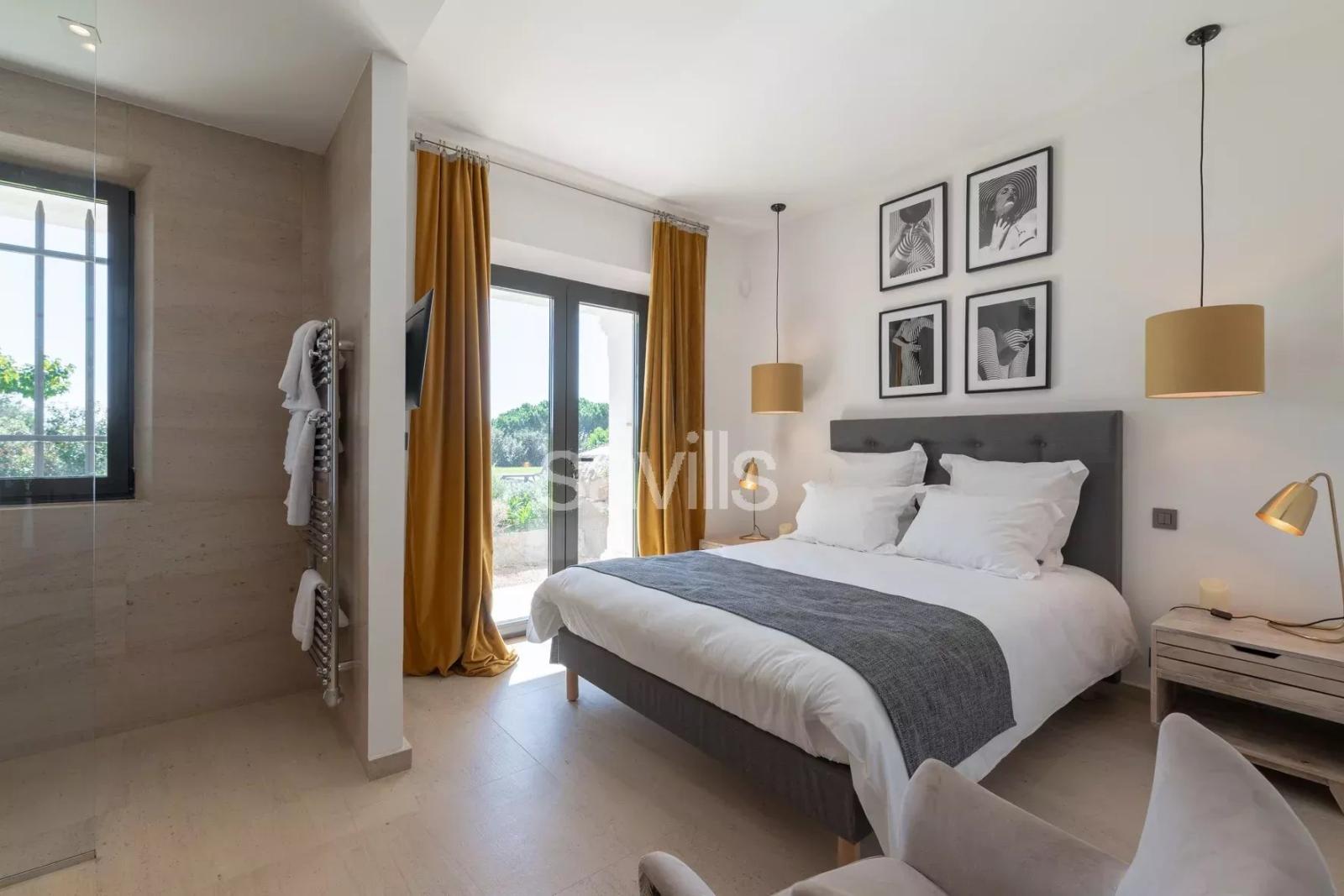 À l’étage, la suite parentale s’ouvre sur un balcon offrant une vue époustouflante sur la mer et les îles d’Or. Elle dispose d'une salle de douche également ouverte sur un balcon, un WC séparé et un dressing.