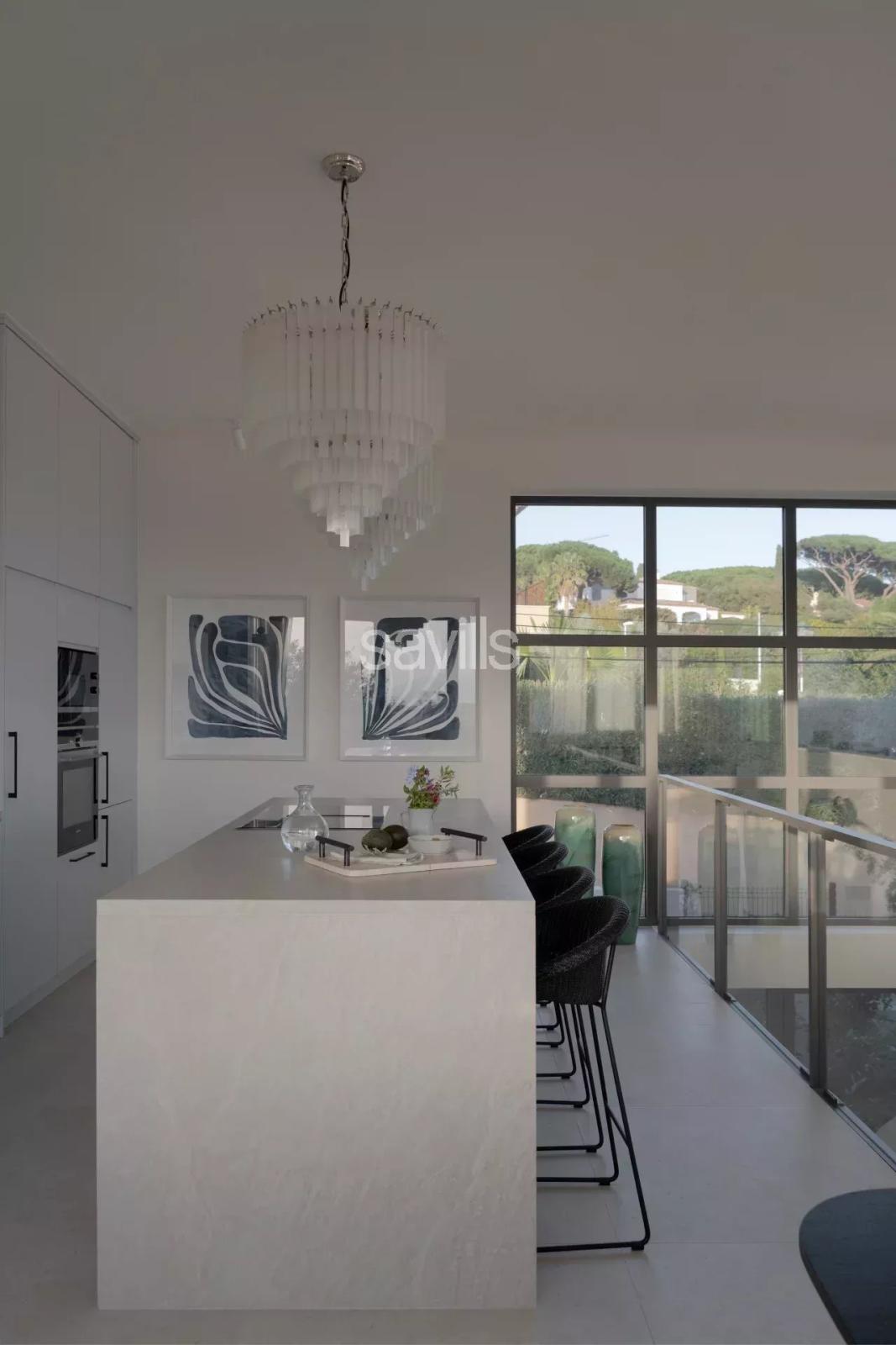 À l’étage, le séjour, la salle à manger et la cuisine équipée s’ouvrent sur une terrasse avec piscine chauffée à débordement, offrant une vue directe sur la mer.
