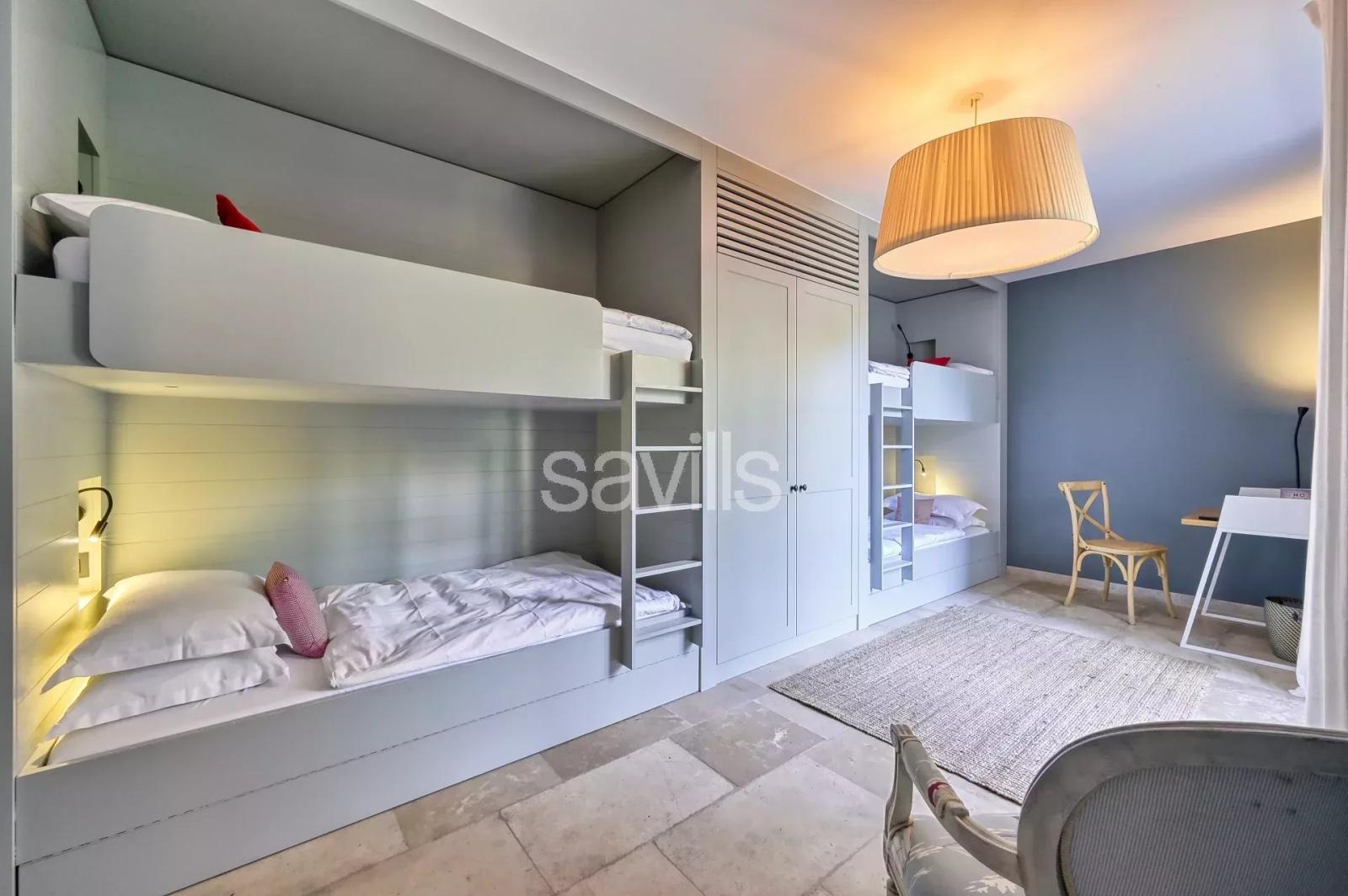 Le premier étage abrite une somptueuse chambre en suite avec salle de douches et WC, ainsi qu'un balcon et une terrasse tropézienne offrant une vue imprenable sur la mer.