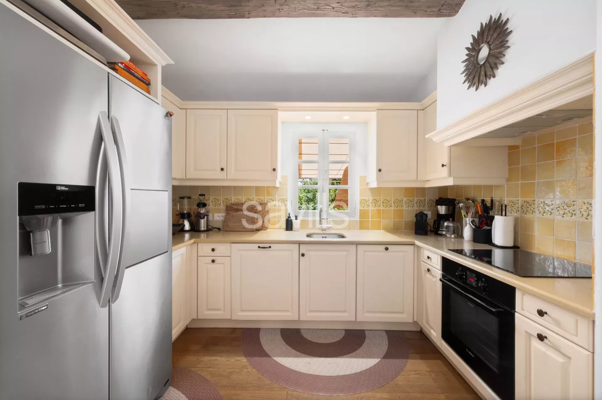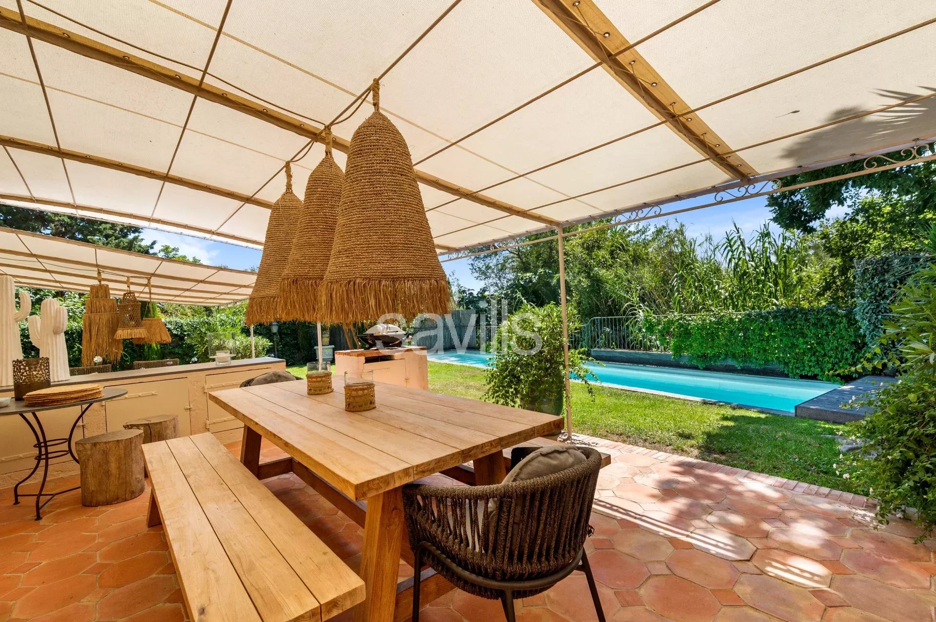 Le poolhouse abrite un salon cosy et une grande table idéale pour des repas en plein air. Il s’ouvre sur un jardin méditerranéen paisible, soigneusement paysagé, qui borde une longue piscine chauffée avec plage immergée et transats pour se prélasser au soleil.