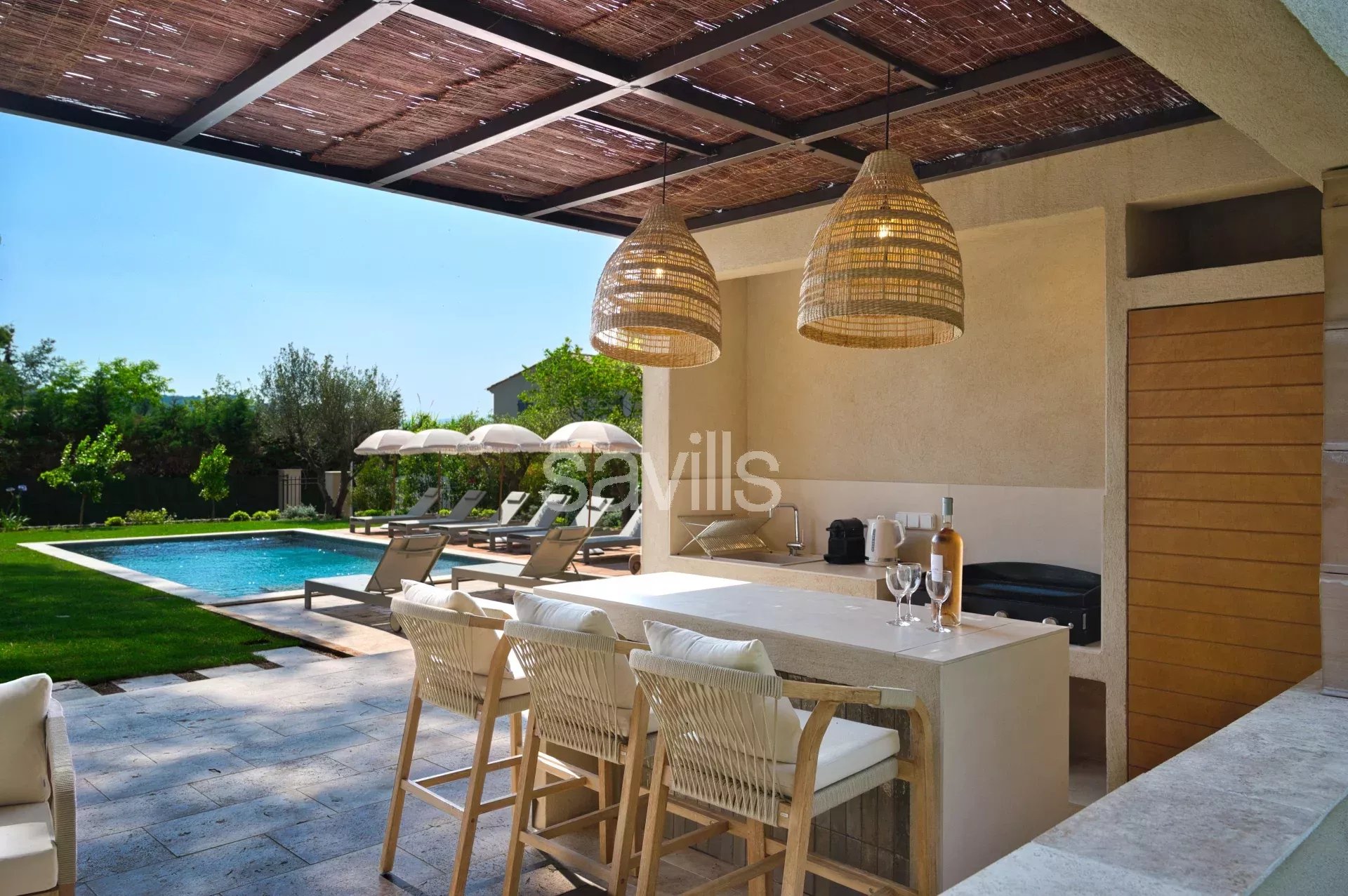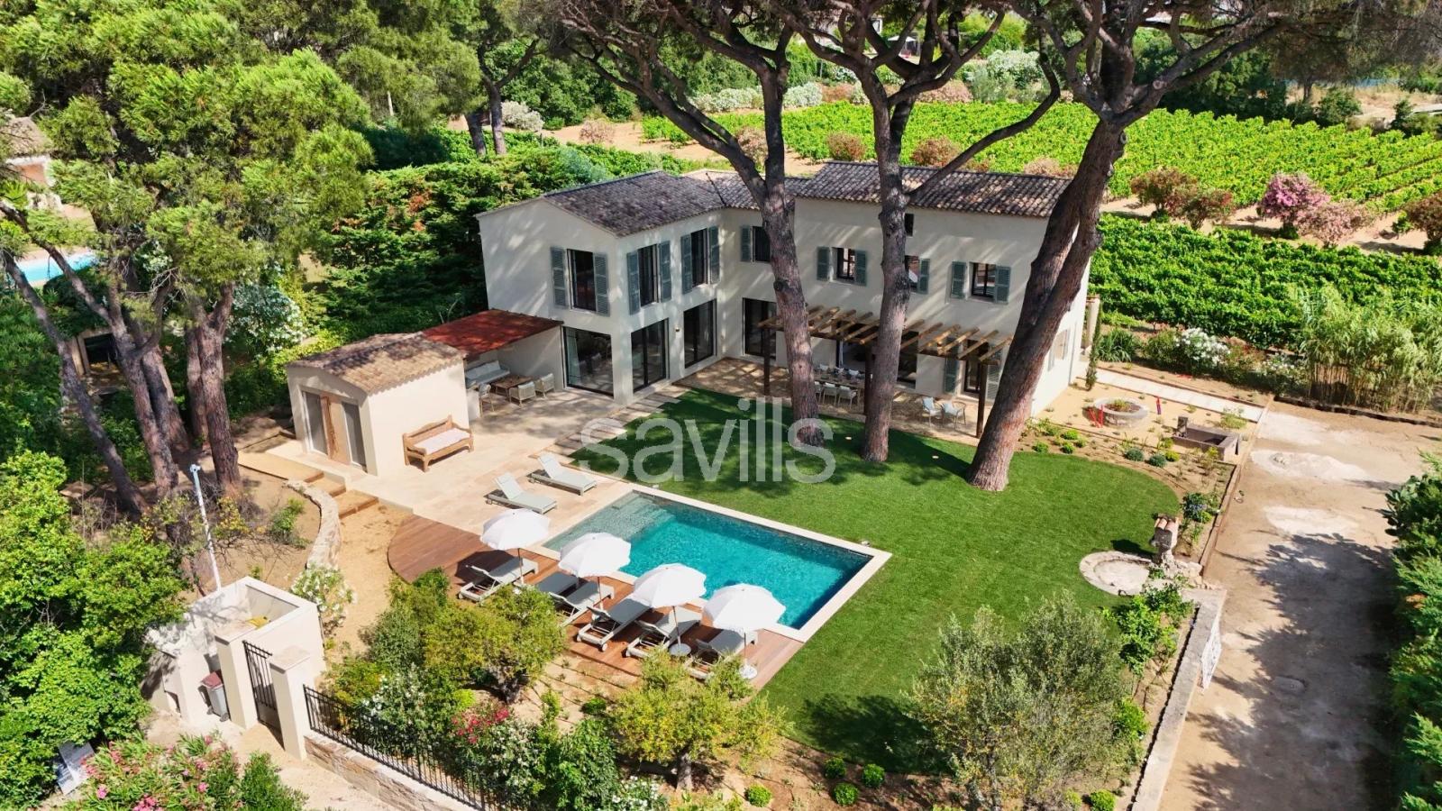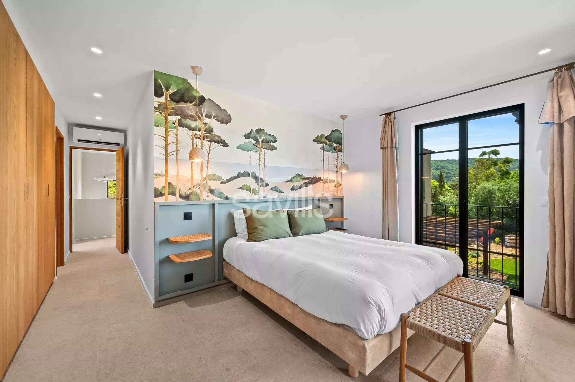 Située dans un cadre paisible en lisière de vignes, cette villa rénovée de 215 m² vous offre un séjour raffiné sous le soleil tropézien.