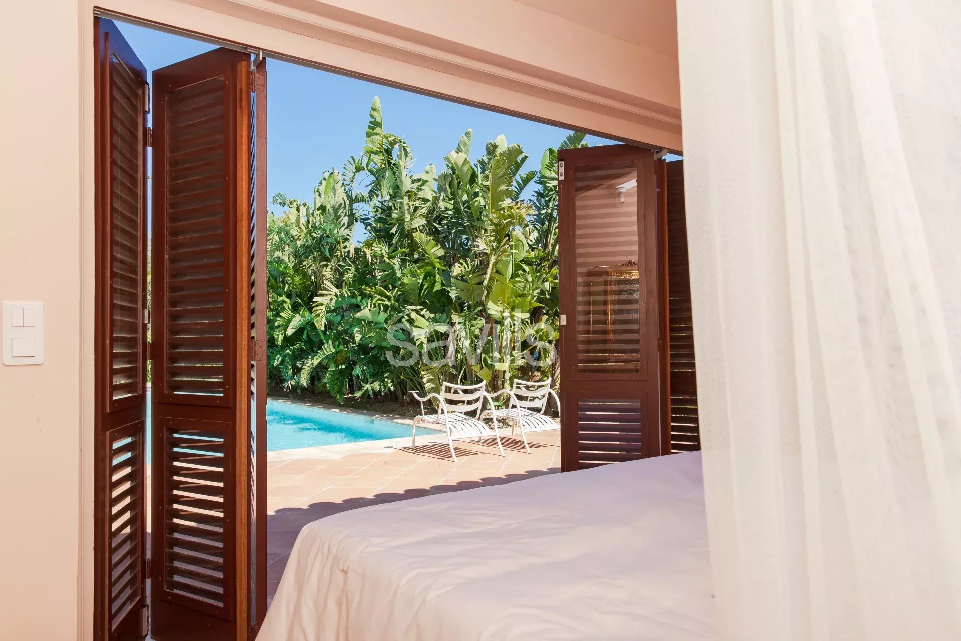 Au rez-de-jardin, un vaste séjour avec cheminée, cuisine ouverte équipée et salle à manger, ainsi qu’une suite avec accès terrasse et piscine, salle de douches, et buanderie.