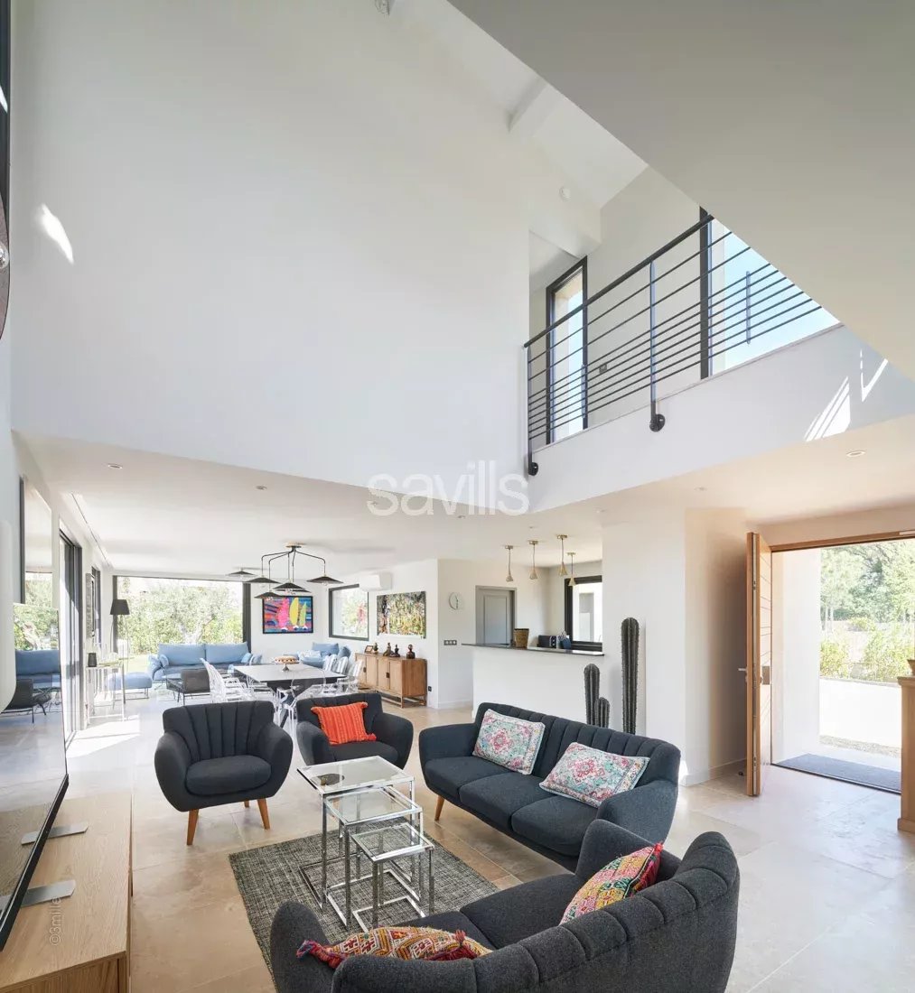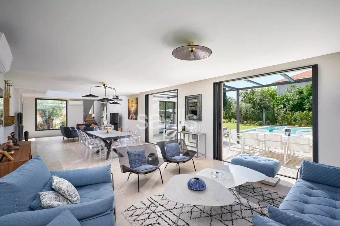 Vaste pièce composée d'un salon / salle à manger/ cuisine ouverte et ouverte sur une terrasse couverte face à la piscine.