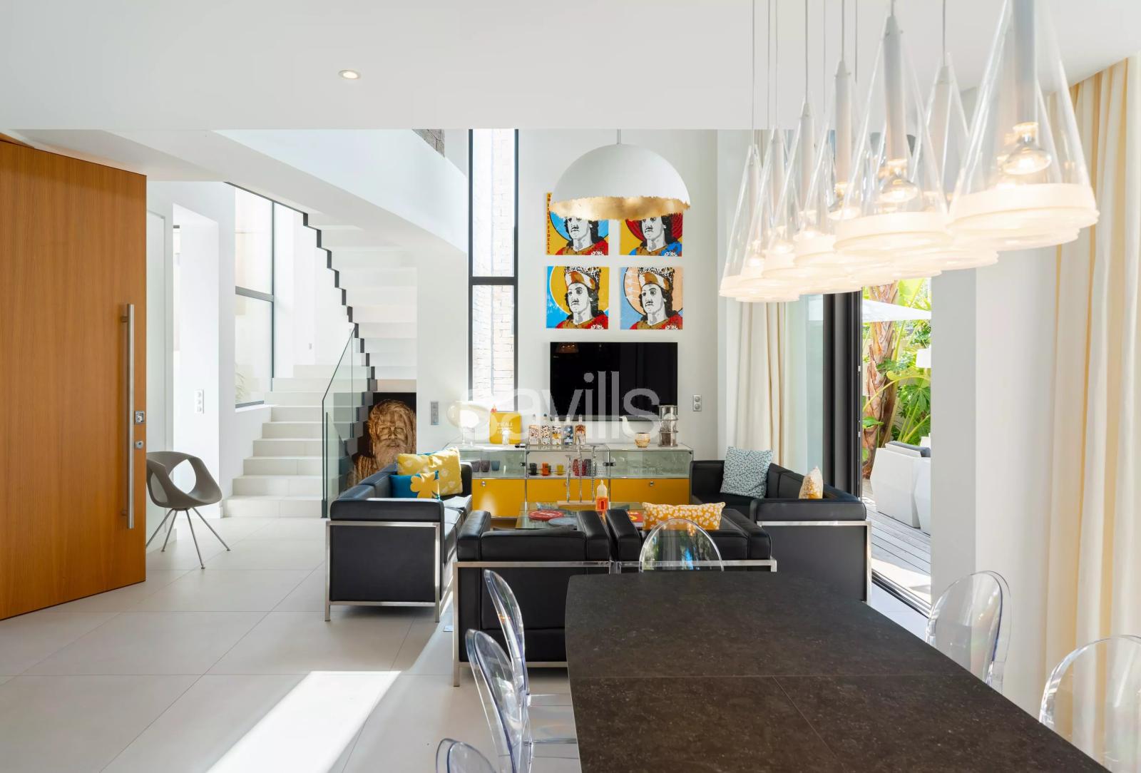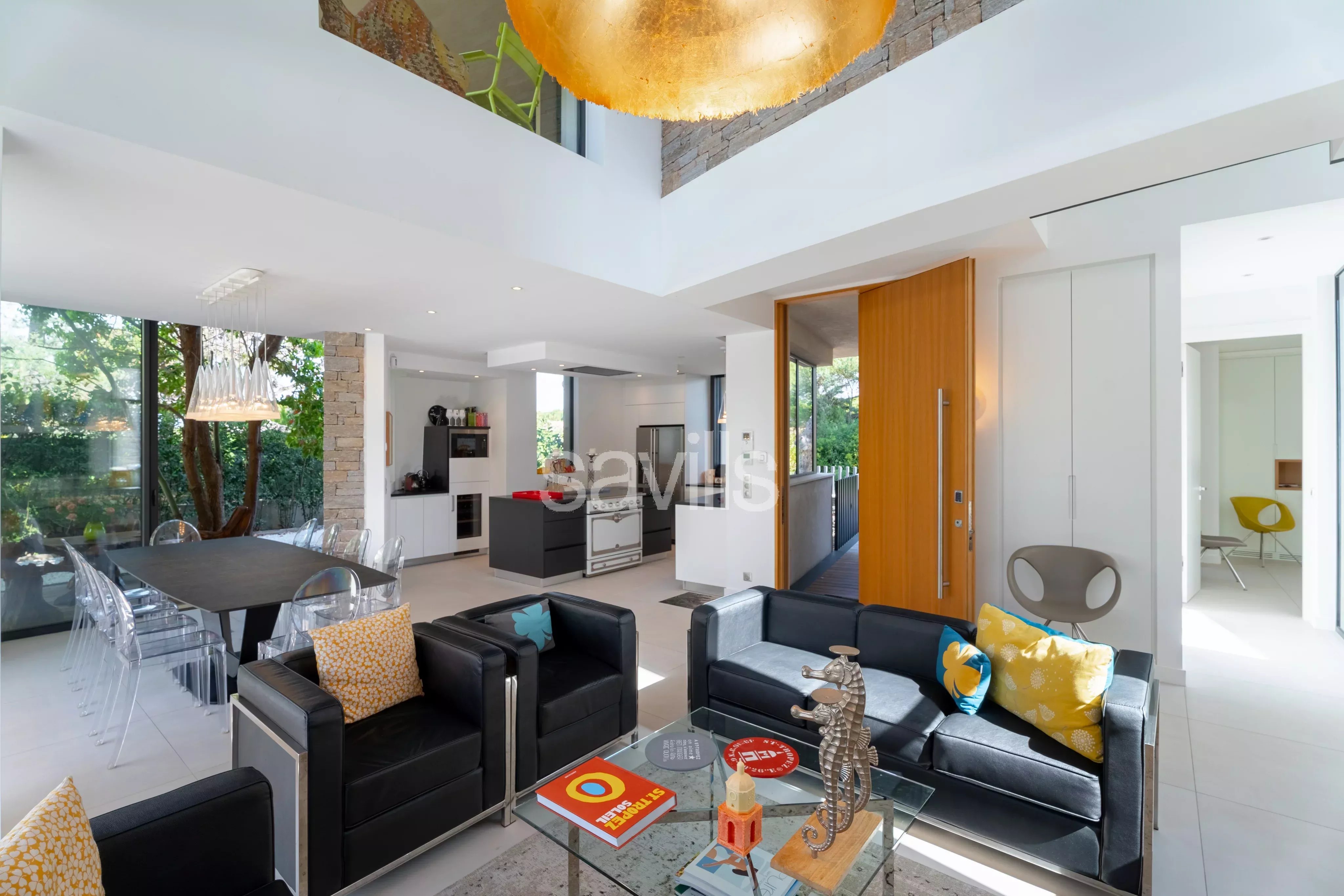 La villa se compose d'un salon lumineux, d'une cuisine ouverte avec ilot central, d'un espace salle à manger, des toilettes invités et de cinq chambres en suite équipées chacune d'une TV.