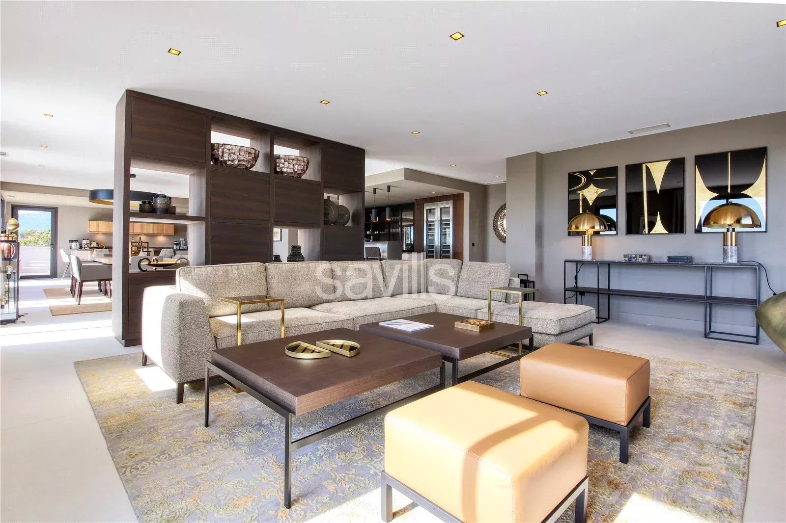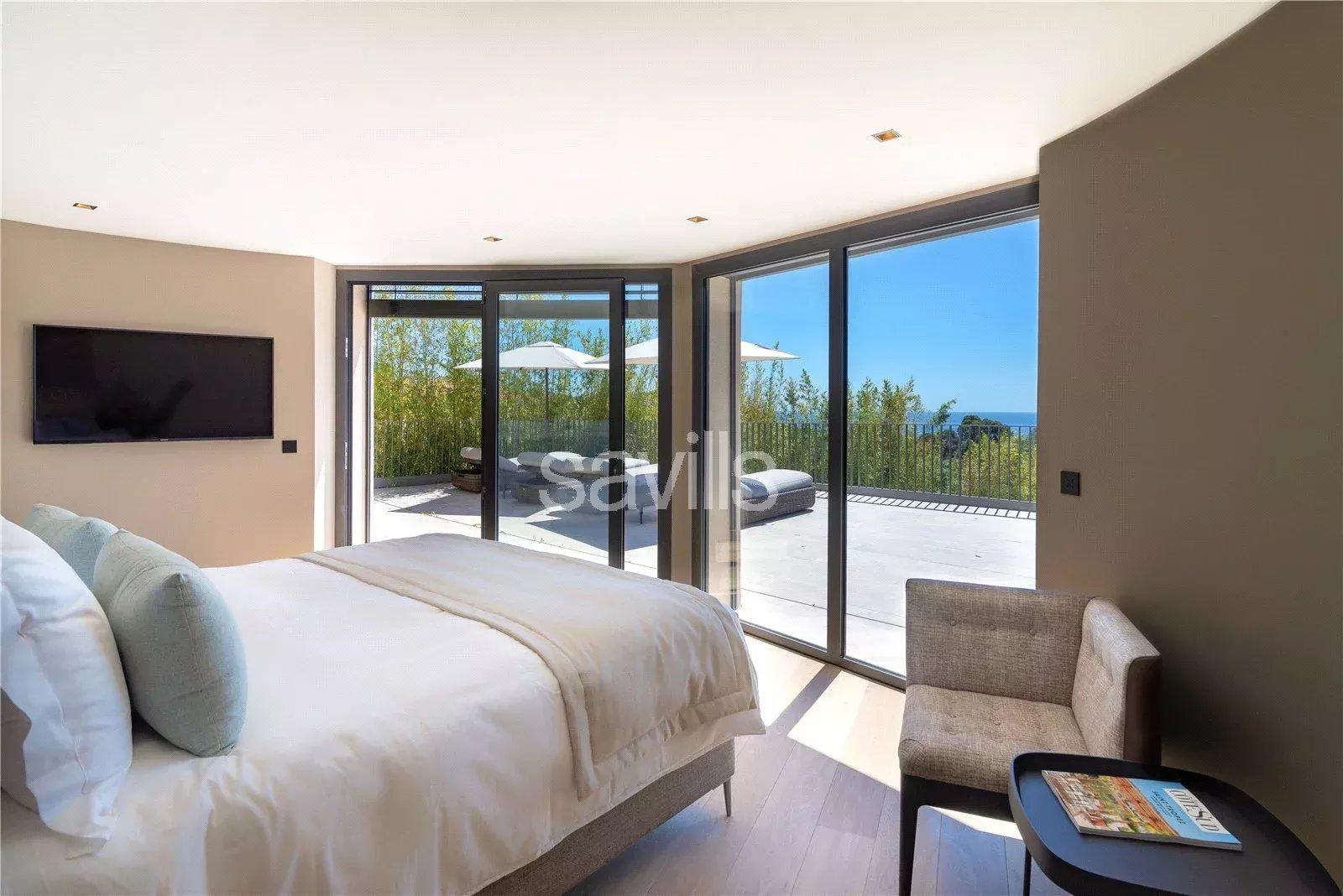 La villa principale offre une vaste pièce à vivre de 120 m² ouverte sur de larges terrasses avec vue mer, un séjour élégant, une salle à manger conviviale, un bar avec caves à vin et une cuisine Gaggenau entièrement équipée.