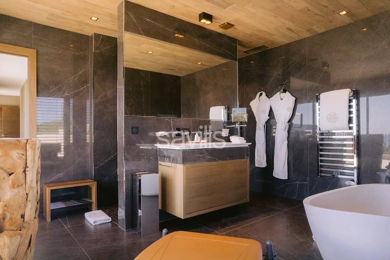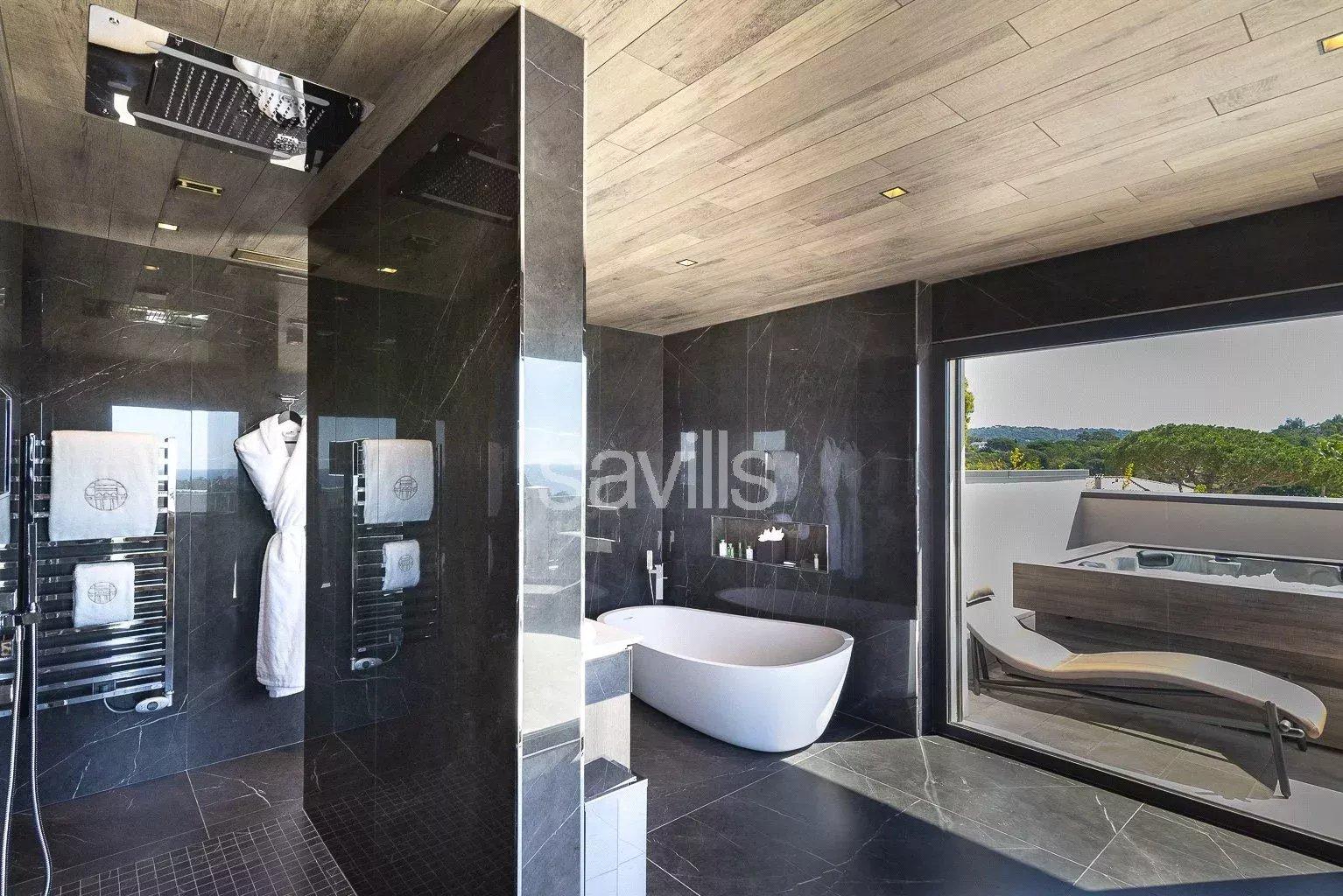 La suite parentale avec jacuzzi sur le toit et terrasse panoramique ainsi qu’une seconde suite au rez-de-jardin assurent confort et intimité.