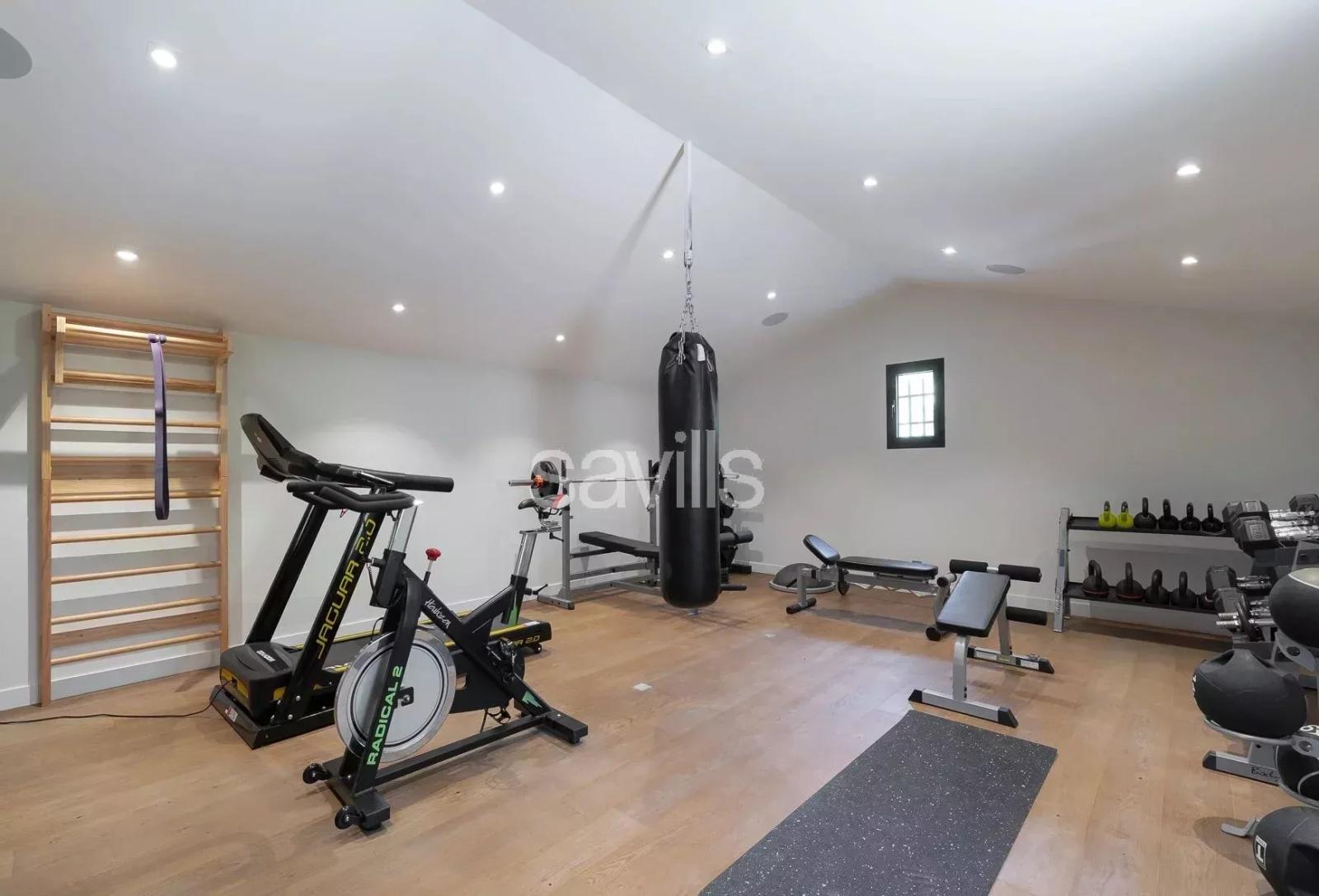 À l’étage, quatre chambres supplémentaires dont une superbe suite parentale avec dressing, ainsi qu’une salle de sport équipée complètent la propriété.