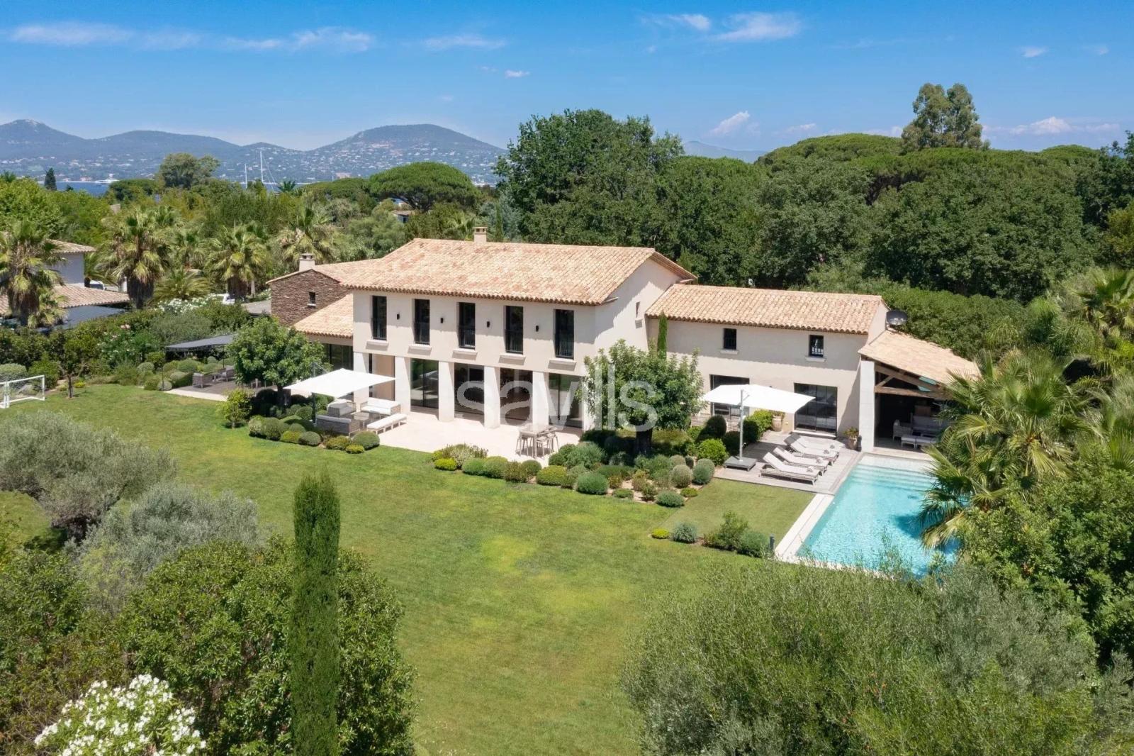 Située dans un domaine privé et sécurisé, à quelques pas des plages, des commodités et de Saint-Tropez, cette superbe villa contemporaine allie élégance, confort et grands volumes.