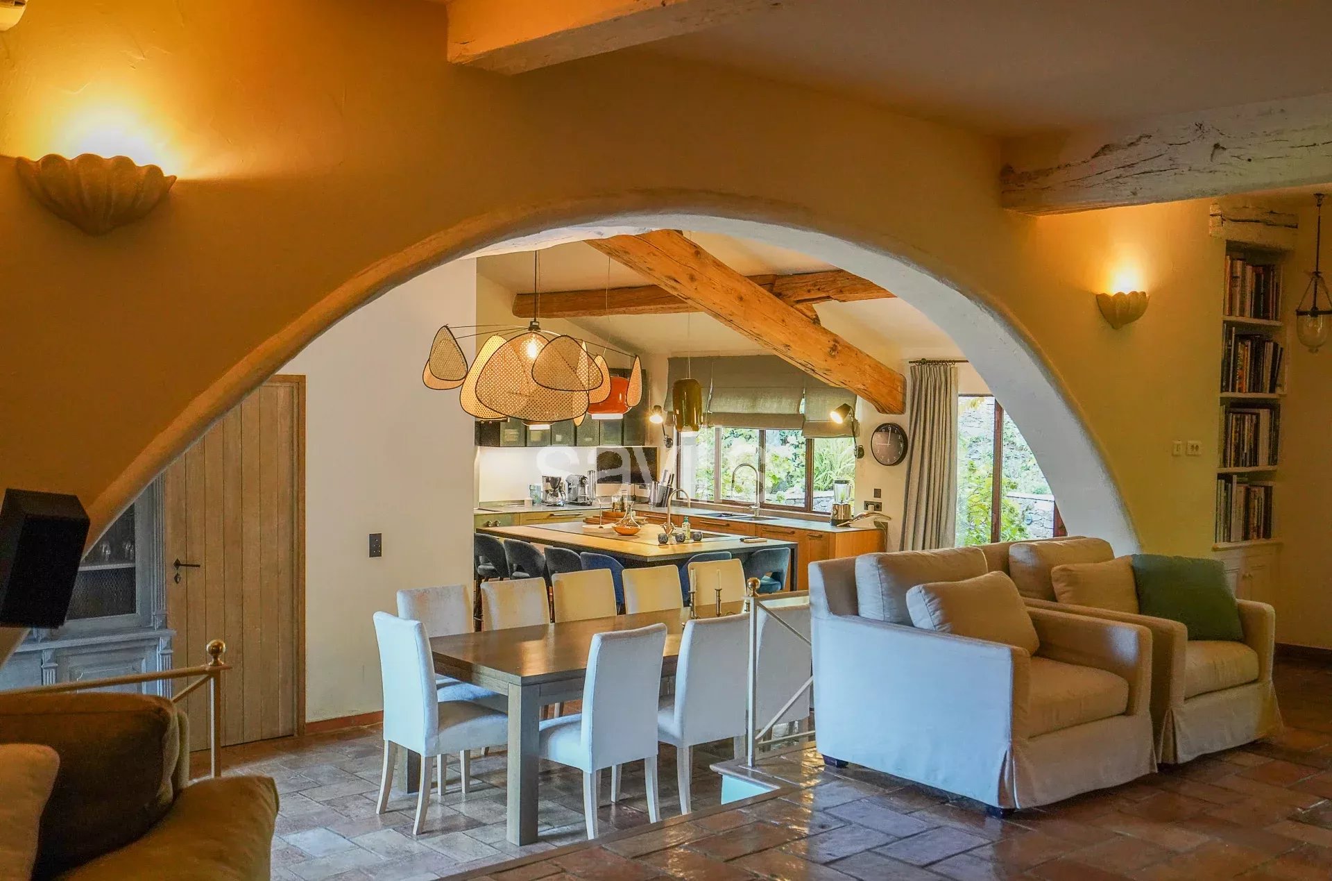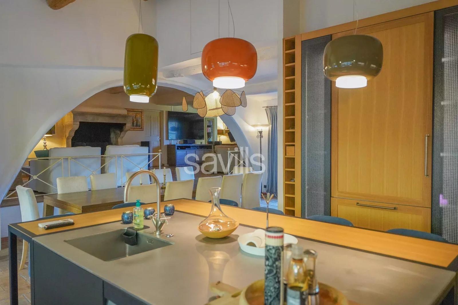 La maison offre un vaste salon sublimé par une majestueuse cheminée en pierre, une salle à manger conviviale, ainsi qu’une cuisine ouverte entièrement équipée. L’espace nuit comprend deux chambres en suite dont l'une avec grand dressing et une autre chambre attenante. Un Wc indépendant se trouve également au même niveau.