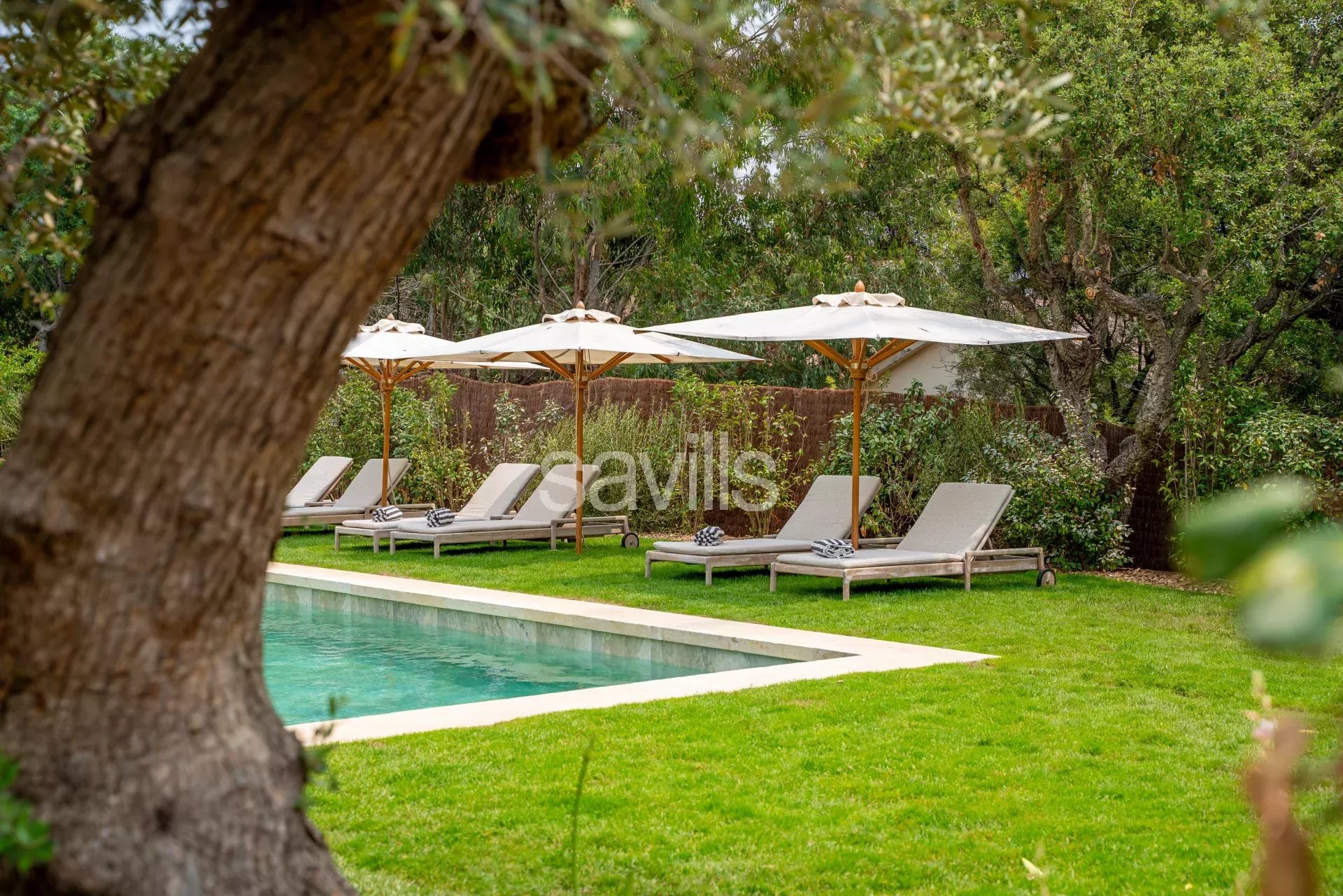 Le jardin paysager de 1 205 m² abrite une piscine chauffée 12x4 m, une grande terrasse avec salle à manger extérieure et barbecue. Le tout dans une atmosphère paisible et exclusive, idéale pour des vacances inoubliables sous le soleil tropézien.