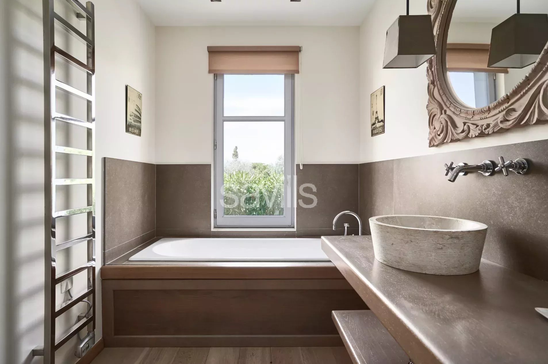 Le jardin paysager accueille une piscine à débordement sans chlore (traitement H₂O₂ et UV solaire), un jacuzzi, un hammam, un pool house aménagé et de nombreuses terrasses avec vue mer.