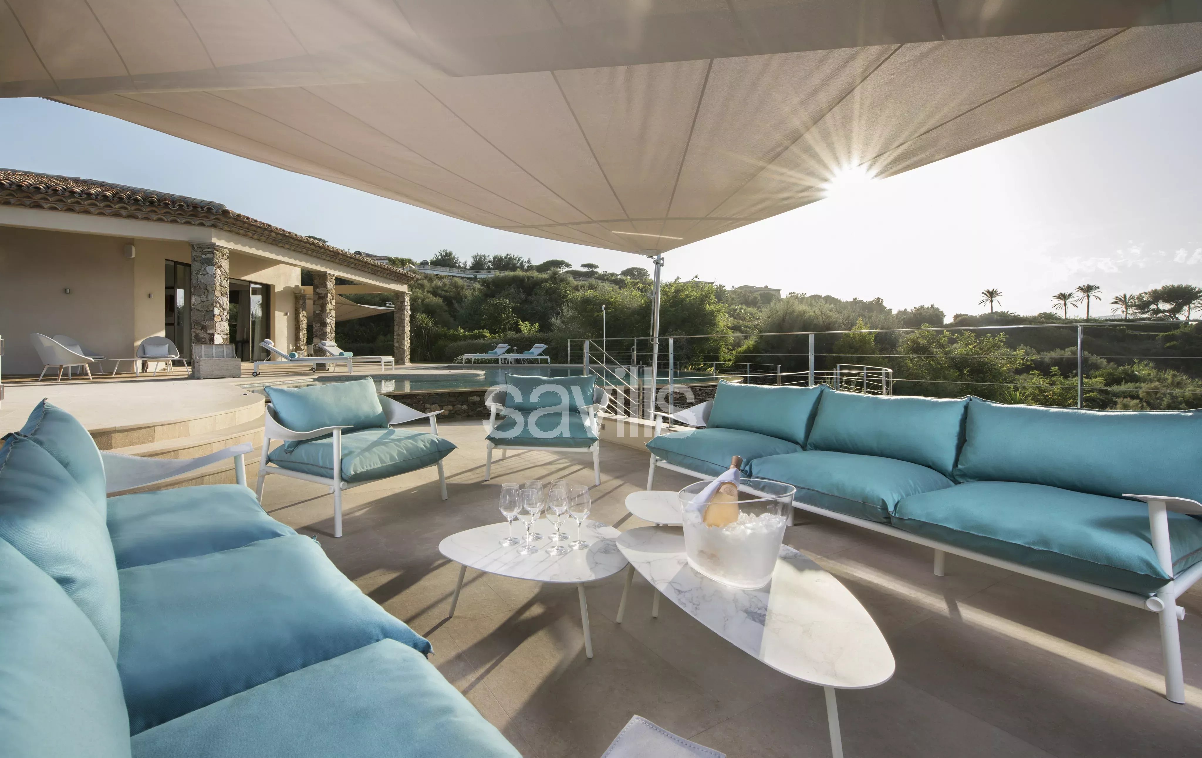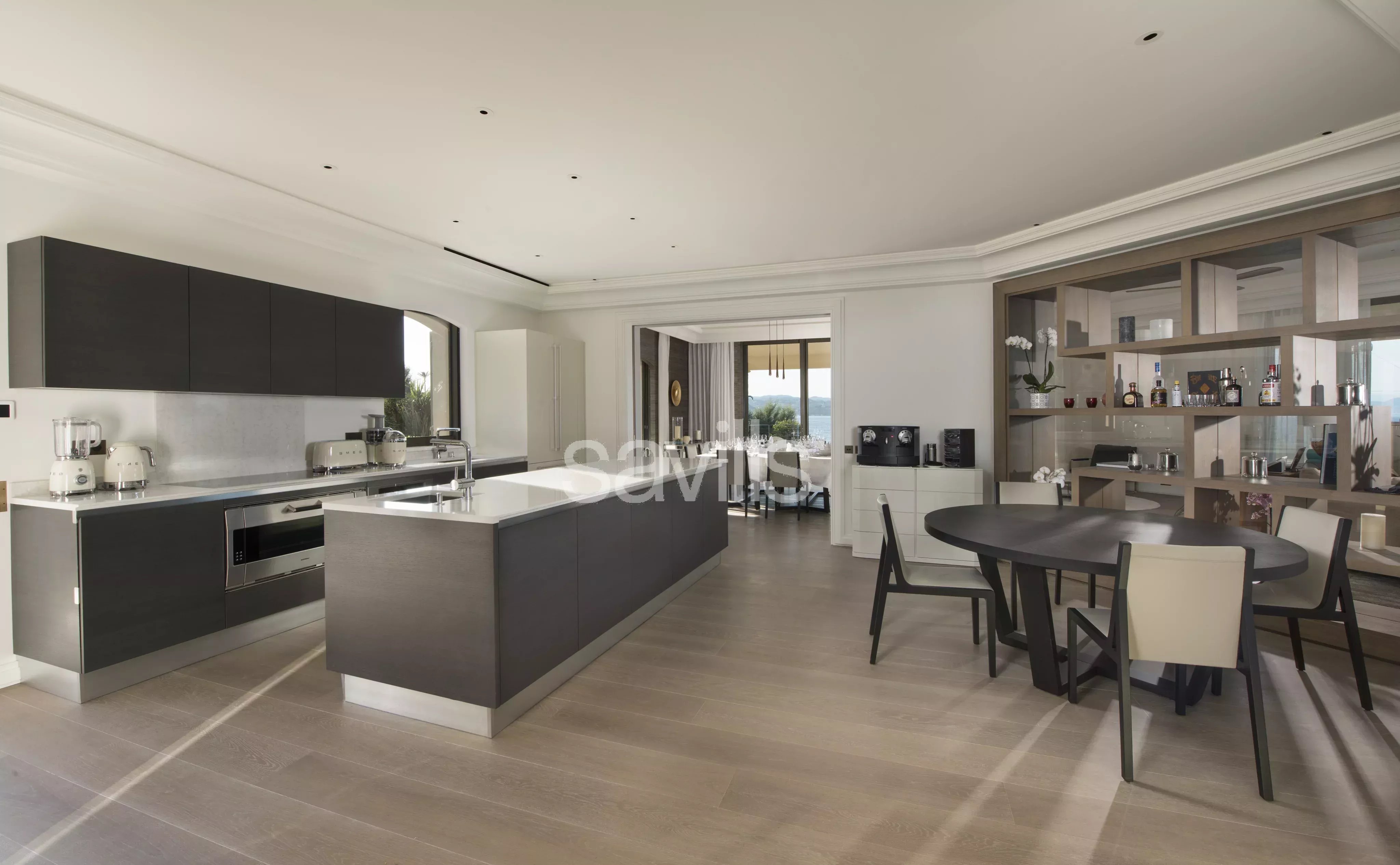 À l'extérieur la propriété est équipée d'une piscine à débordement face à la mer, d'une salle de sport, de vastes terrasses aménagées, d'un accès direct à la mer, d'un Helipad le tout sur un terrain d'environ 5 150 m² paysager. La climatisation est disponible dans chaque pièce de la propriété, ainsi qu'un accès wifi par la fibre. Pour votre sécurité un système d'alarme et de caméras est présent.