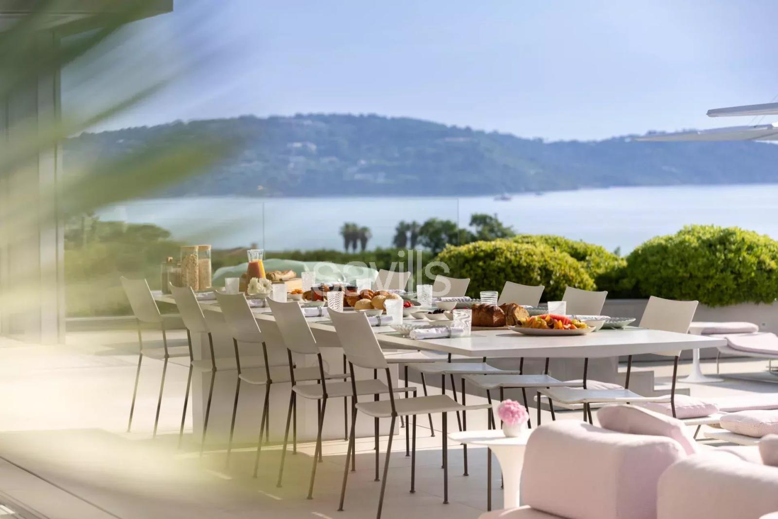 Sur un terrain paysager d'environ 1 hectare offrant une vue mer panoramique, la maison dispose d'un salon ouvert sur le jardin avec accès direct à la piscine, cuisine ouverte, sept chambres ensuite incluant 1 chambre d'enfant avec trois lits simples.