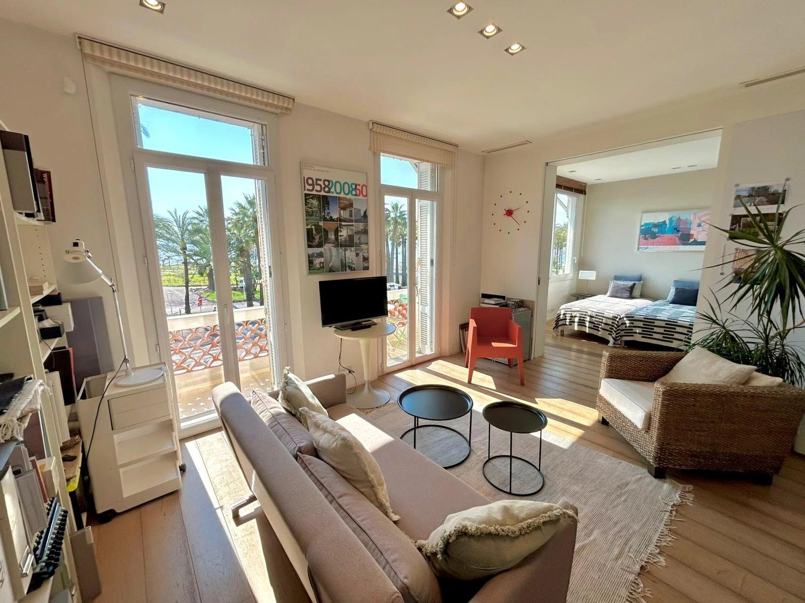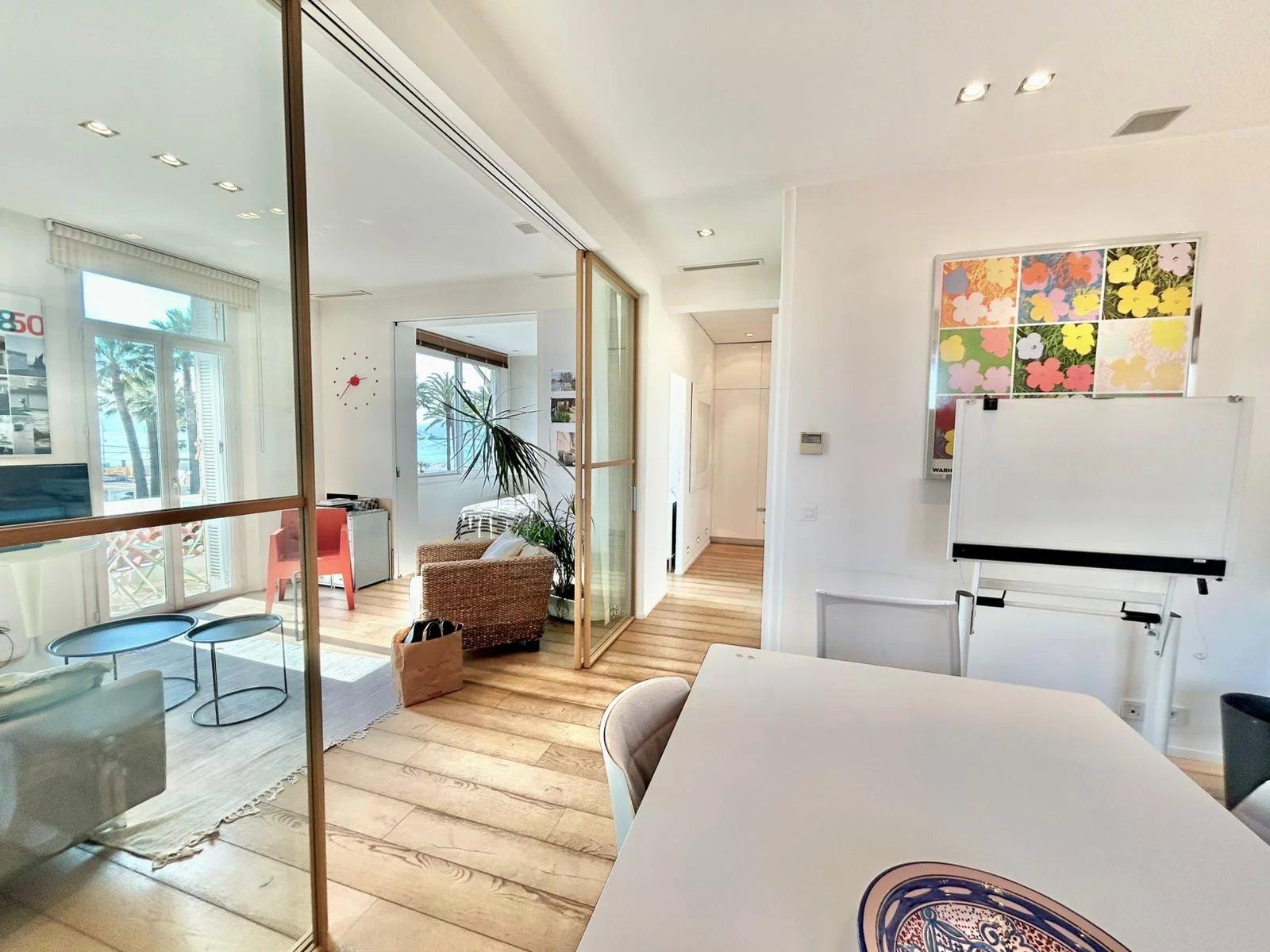 Superbe appartement 3 pièces entièrement rénové avec des prestations haut de gamme, idéalement situé sur la Croisette et bénéficiant d’une belle vue mer. Conçu par un architecte d'intérieur avec une attention particulière au confort, il dispose d’une excellente isolation phonique, d’une climatisation gainable discrète, d’un système d’éclairage intelligent et d’une sonorisation Sonos intégrée.