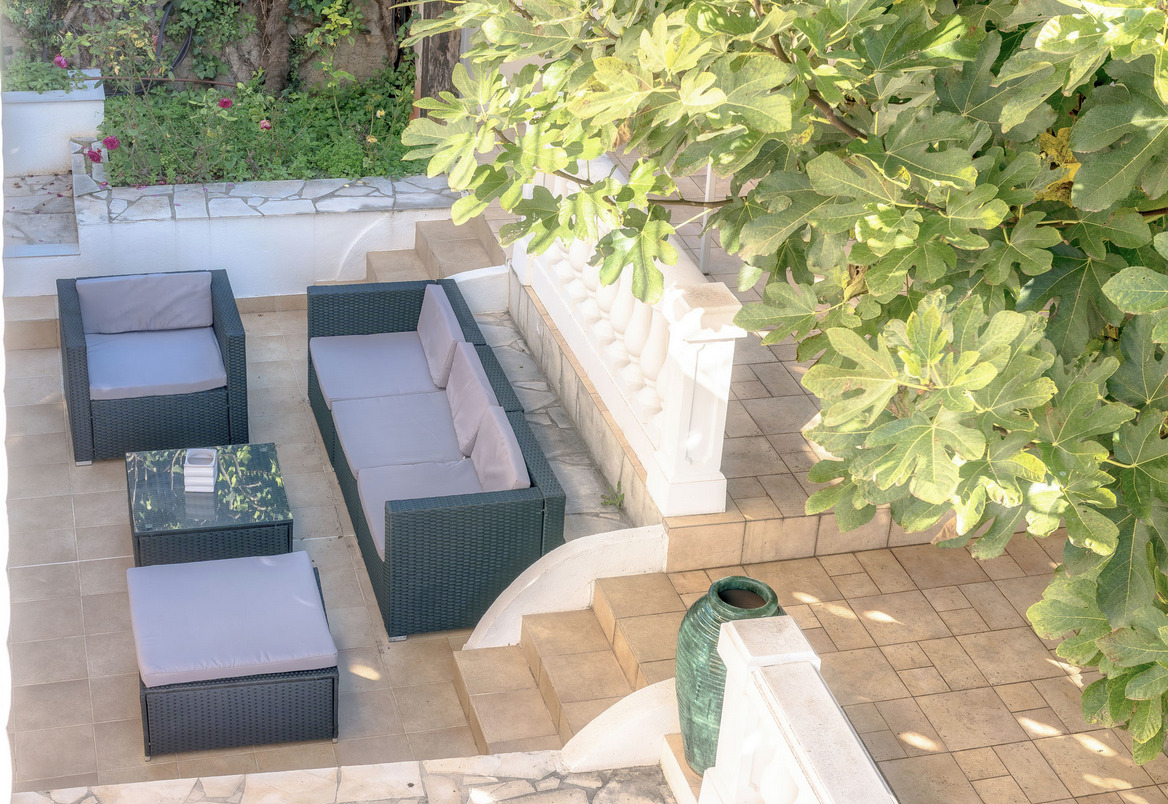 Du côté est, la villa bénéficie d'une grande terrasse carrelée, équipée d'un barbecue maçonné avec point d'eau et rangements. Les repas seront pris sur une table et banc en pierre à l'abri d'un store électrique et d'un majestueux figuier. Une place de parking intérieur est disponible.