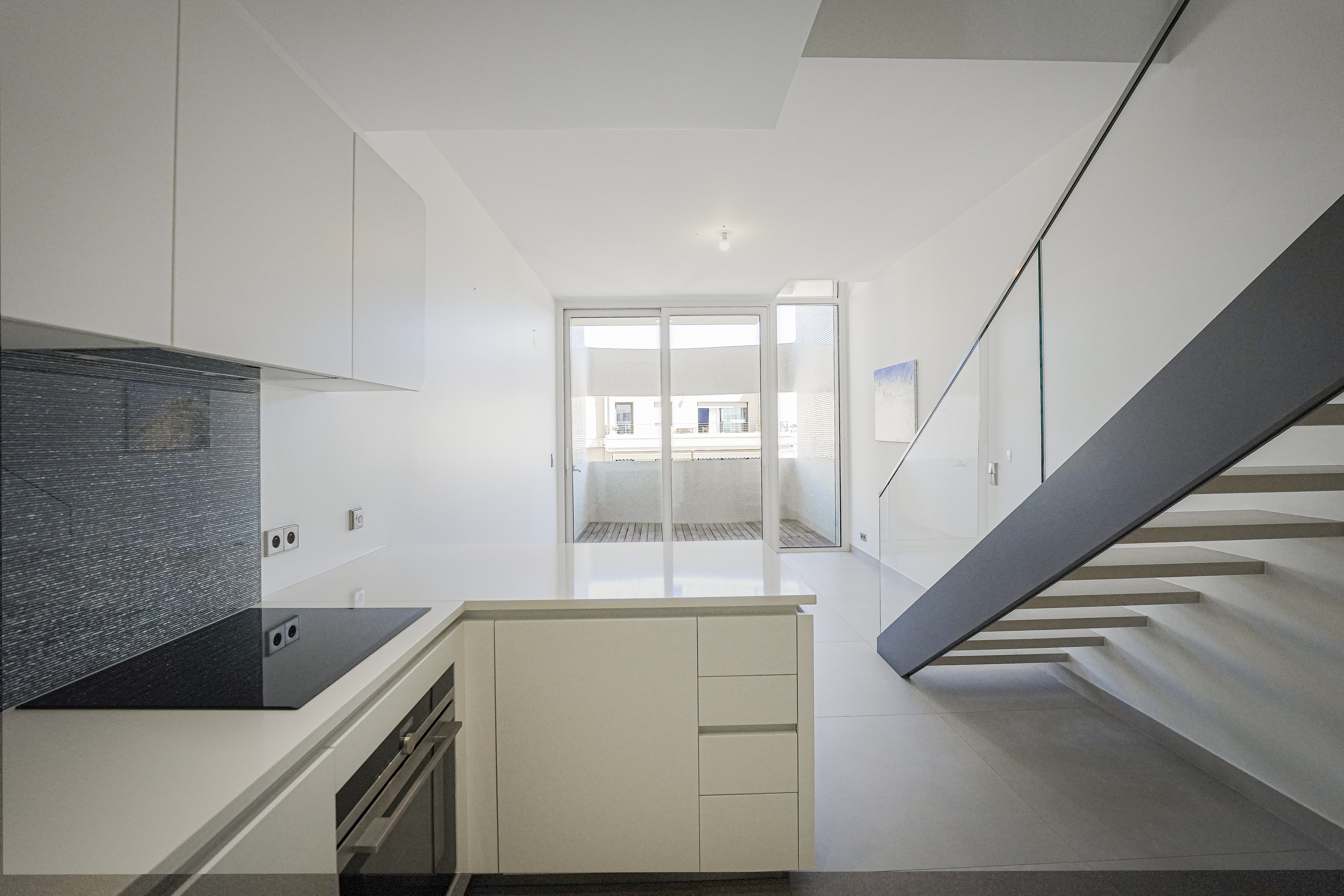 - Un séjour salle à manger avec cuisine américaine équipée s'ouvrant sur une loggia