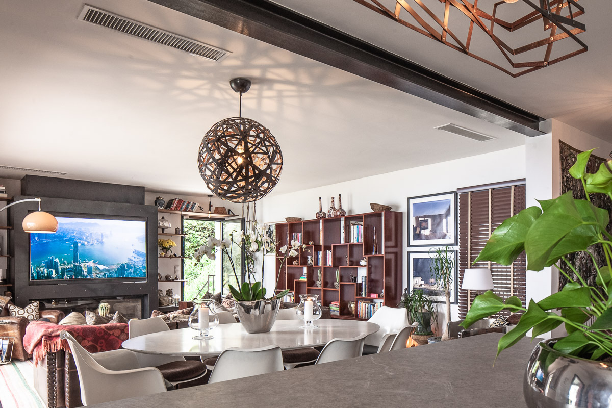 - Un grand salon/salle à manger s'ouvrant sur une terrasse suspendue. Cette pièce est très conviviale et chaleureuse avec sa grande cheminée et ses baies vitrées à galandage offrant plus de lumière et une vue spectaculaire.
