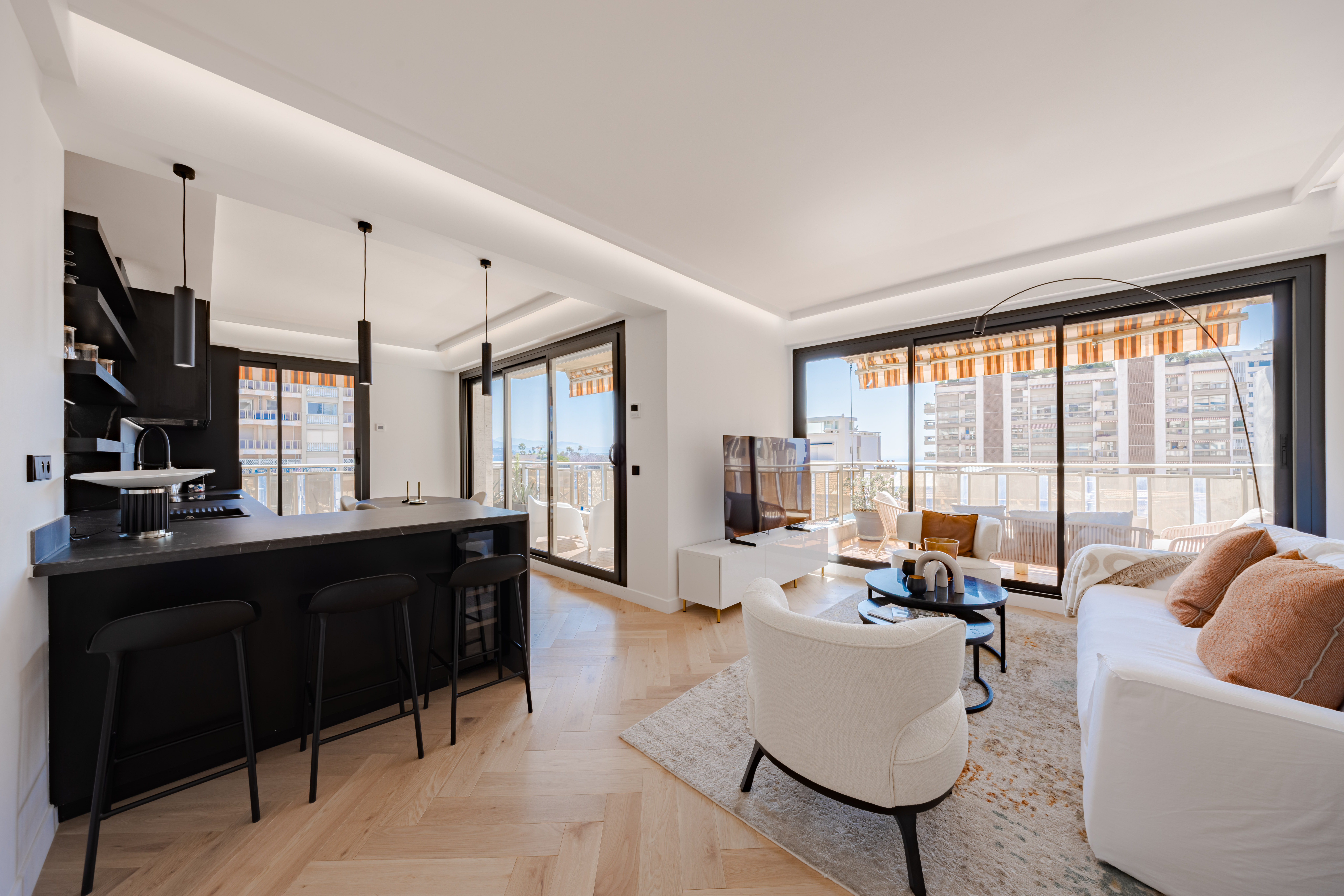 Situé dans un immeuble de standing, à quelques pas du Carré d’Or et de la place du Casino, cet appartement entièrement rénové avec des matériaux haut de gamme allie confort et raffinement.