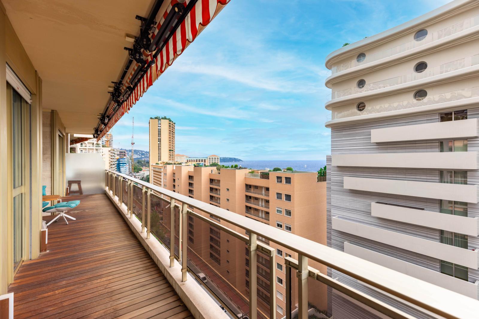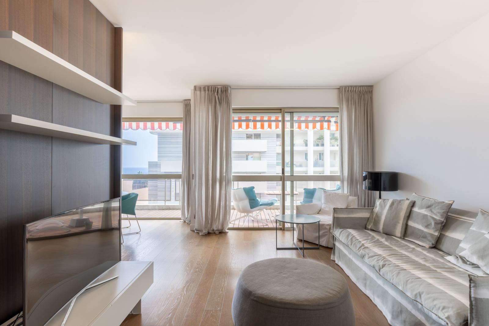 Superbe 3 pièces rénové avec matériaux haut de gamme, situé au 8ᵉ étage d’un immeuble moderne avec concierge sur le Boulevard du Larvotto. À deux pas des plages et commerces via l’accès arrière.