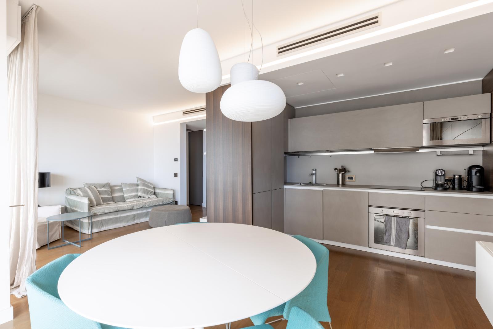 L’appartement se compose d’un séjour avec cuisine américaine, deux chambres avec vue mer, deux salles de douche et une buanderie. Toutes les pièces principales ouvrent sur une grande terrasse avec vue mer.