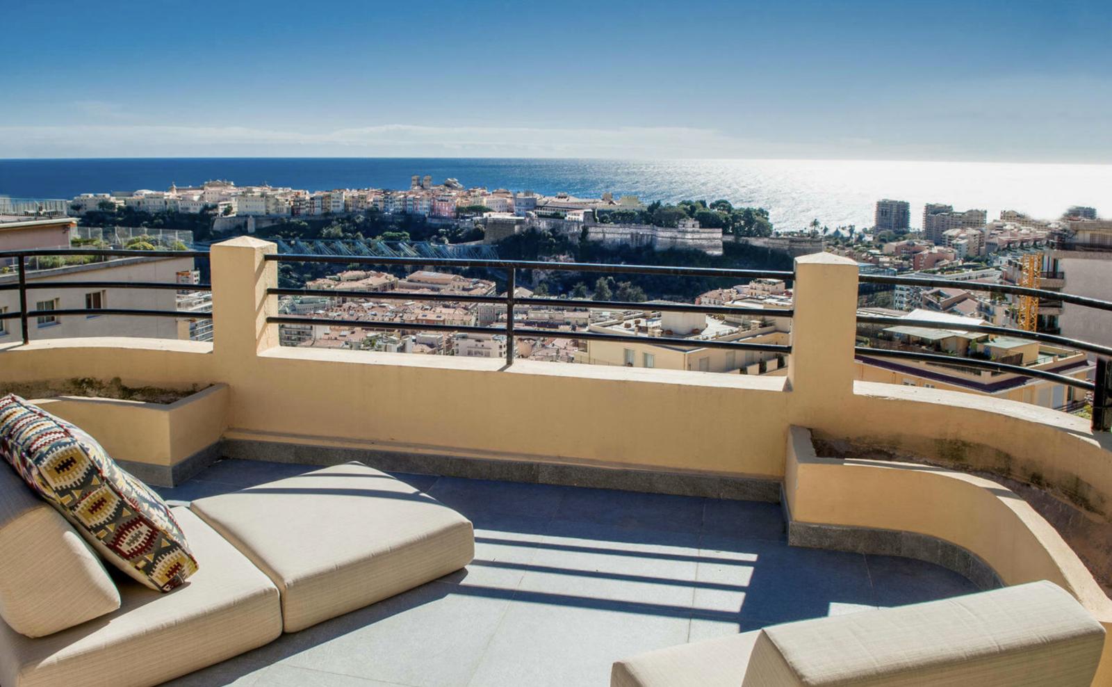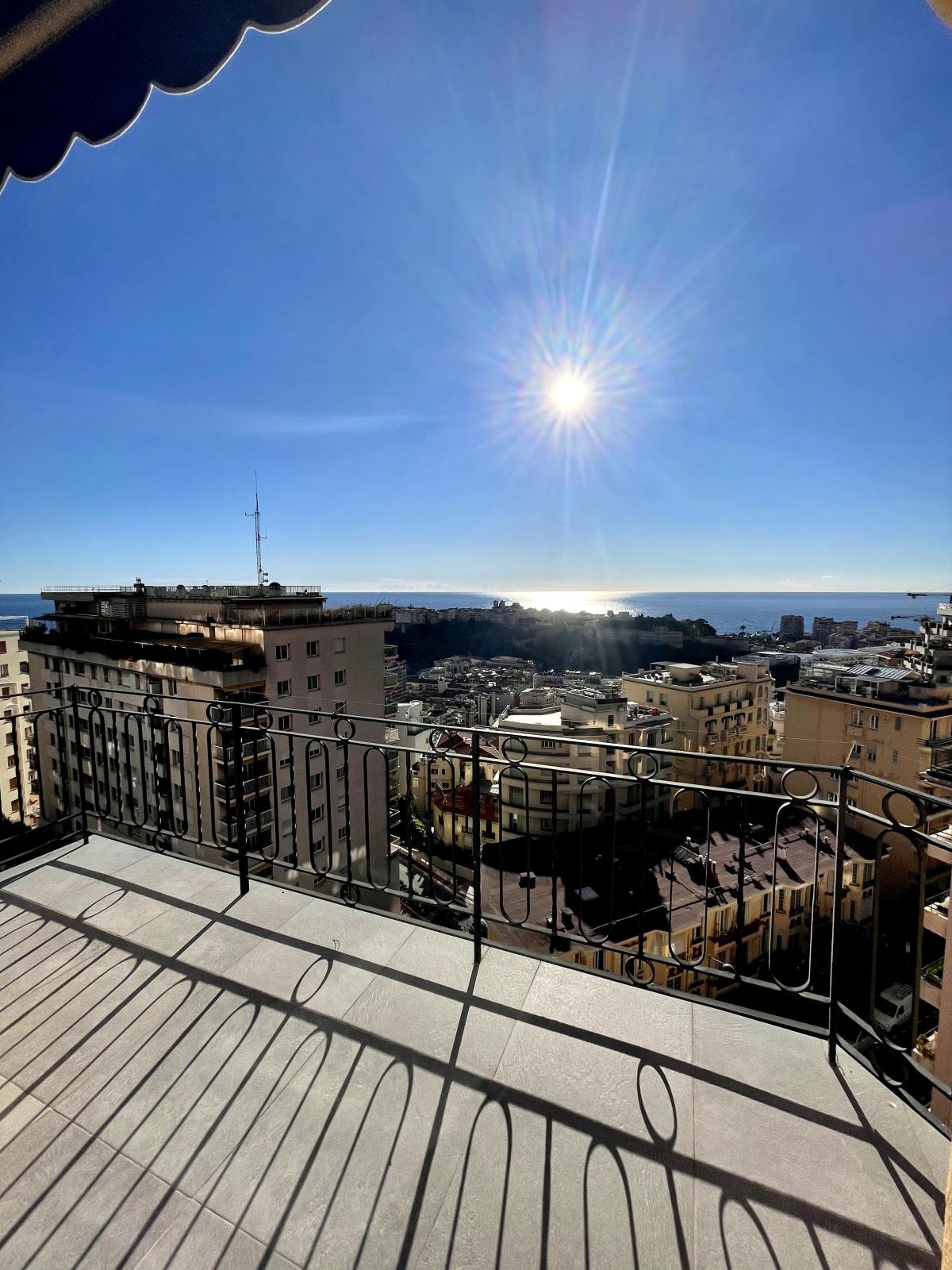 Magnifique penthouse en duplex entièrement rénové dans un immeuble Bourgeois au boulevard de Belgique.  Il se compose d'une entrée,  un salon/ salle à manger ouvrant sur un balcon et offrant une belle vue mer,  une cuisine équipée ouverte,  2 chambres avec salles de douche, chacune ouvrant sur un balcon, une troisième chambre avec sa salle de bains. A l'étage supérieur, spacieuse terrasse aménagée avec pergola et cuisine d'été offrant une vue mer.