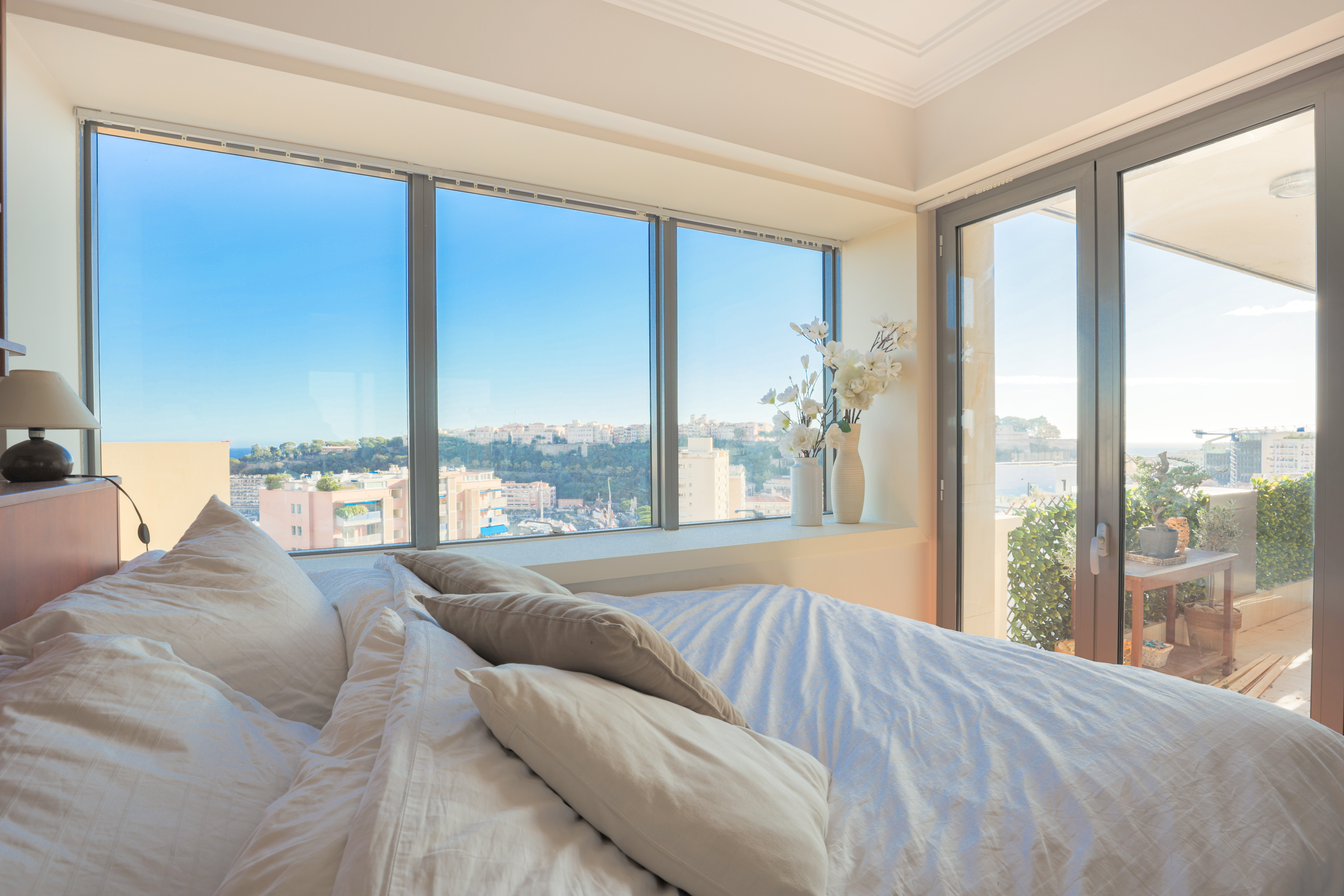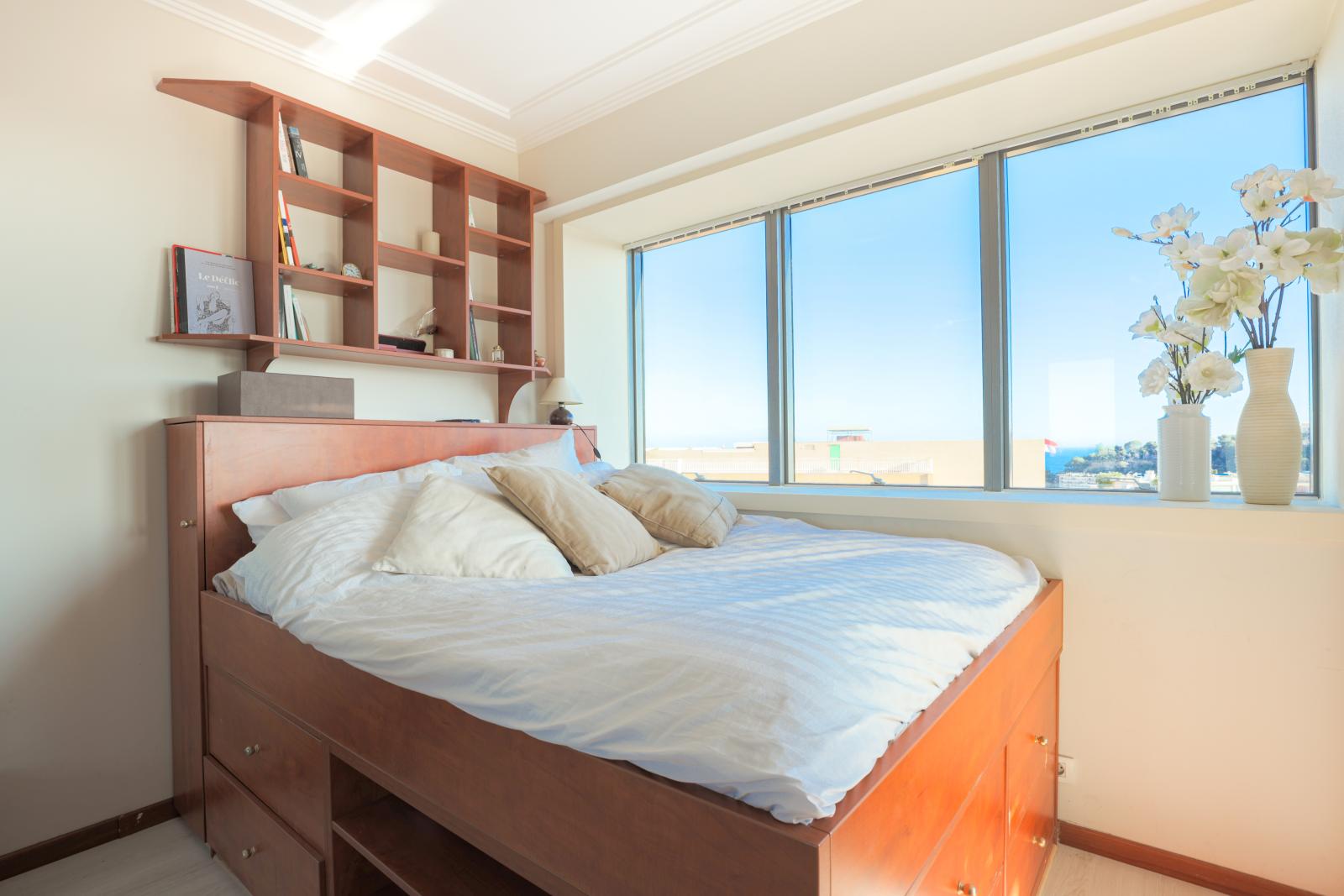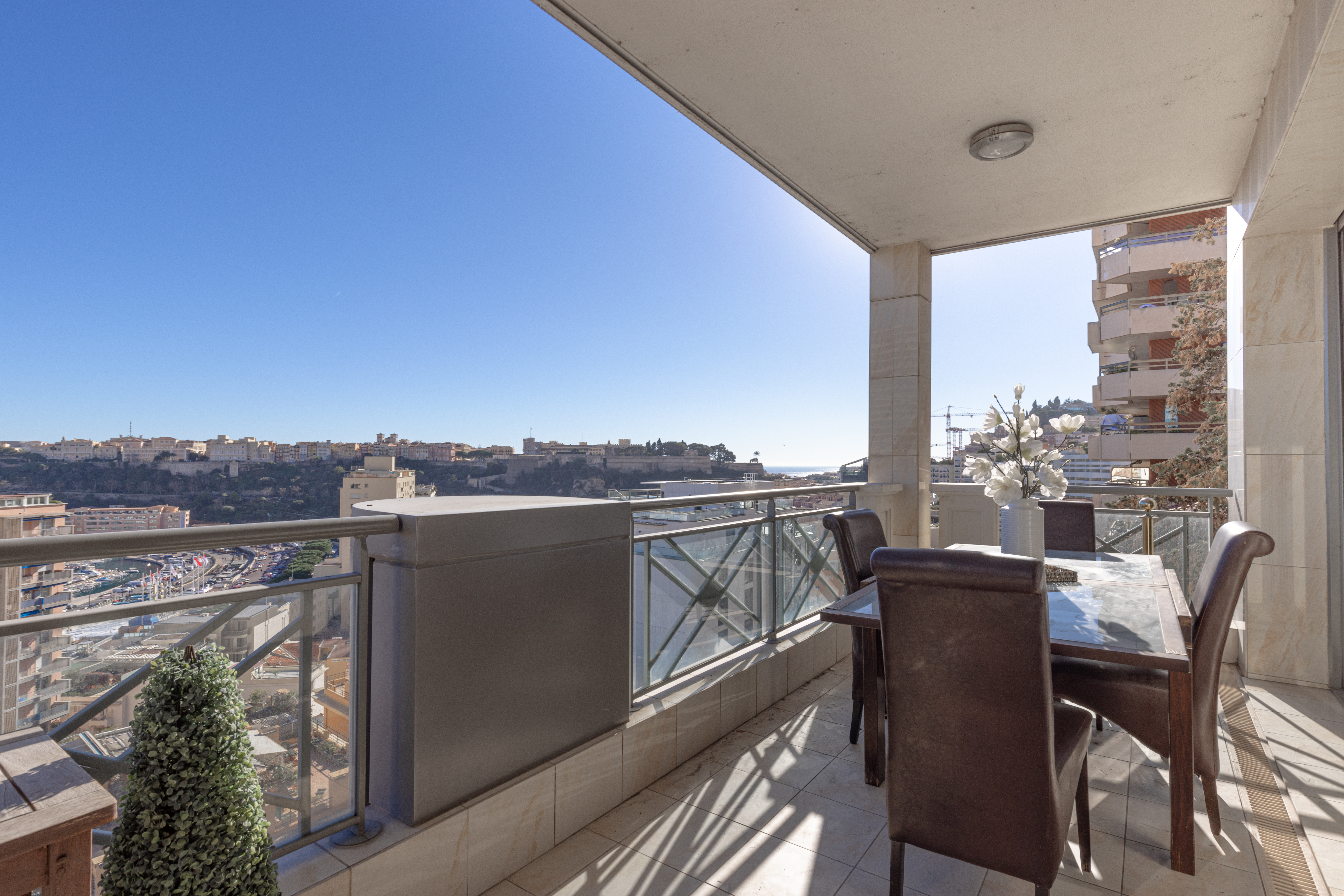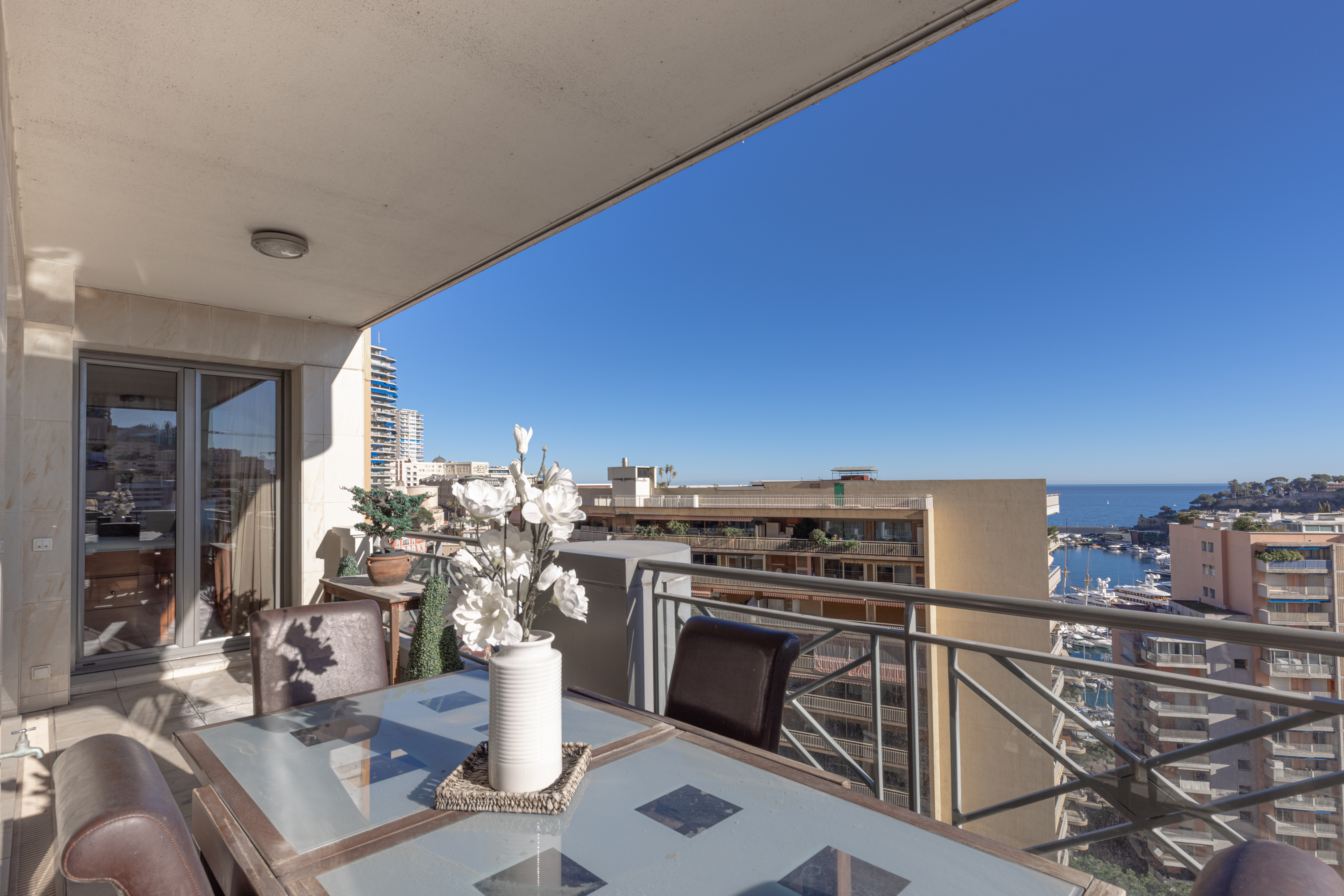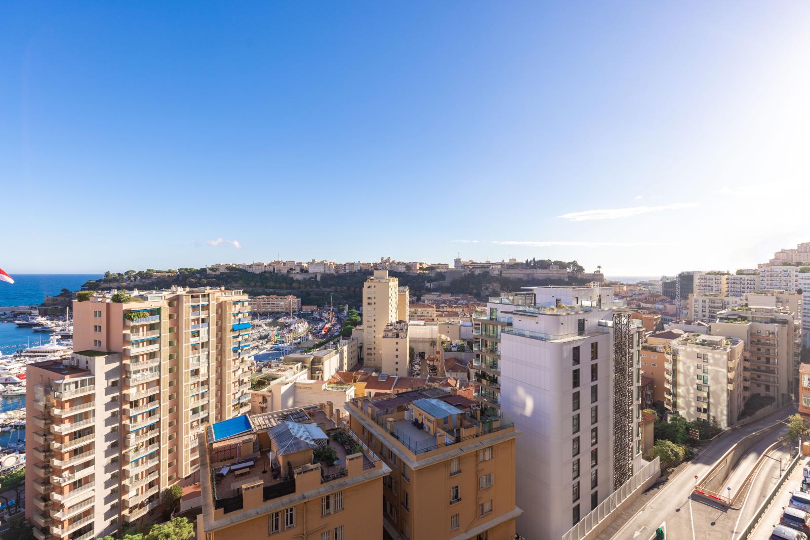 L’appartement domine le port de Monaco et offre une jolie vue sur la mer et le Palais Princier.