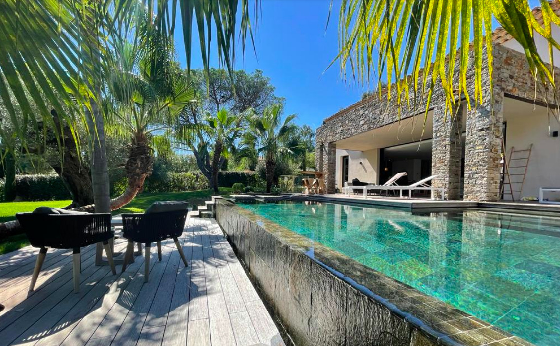 Somptueuse villa Tropézienne, La Villa Baya a des airs de demeure balinaise avec son patio intérieur, ses terrasses surélevées et vitrées donnant sur l’immense piscine carrelée à débordement et sa déco pensée au millimètre. En plein cœur de St-Tropez, la villa se trouve à seulement 1km de la jolie Place des Lices.