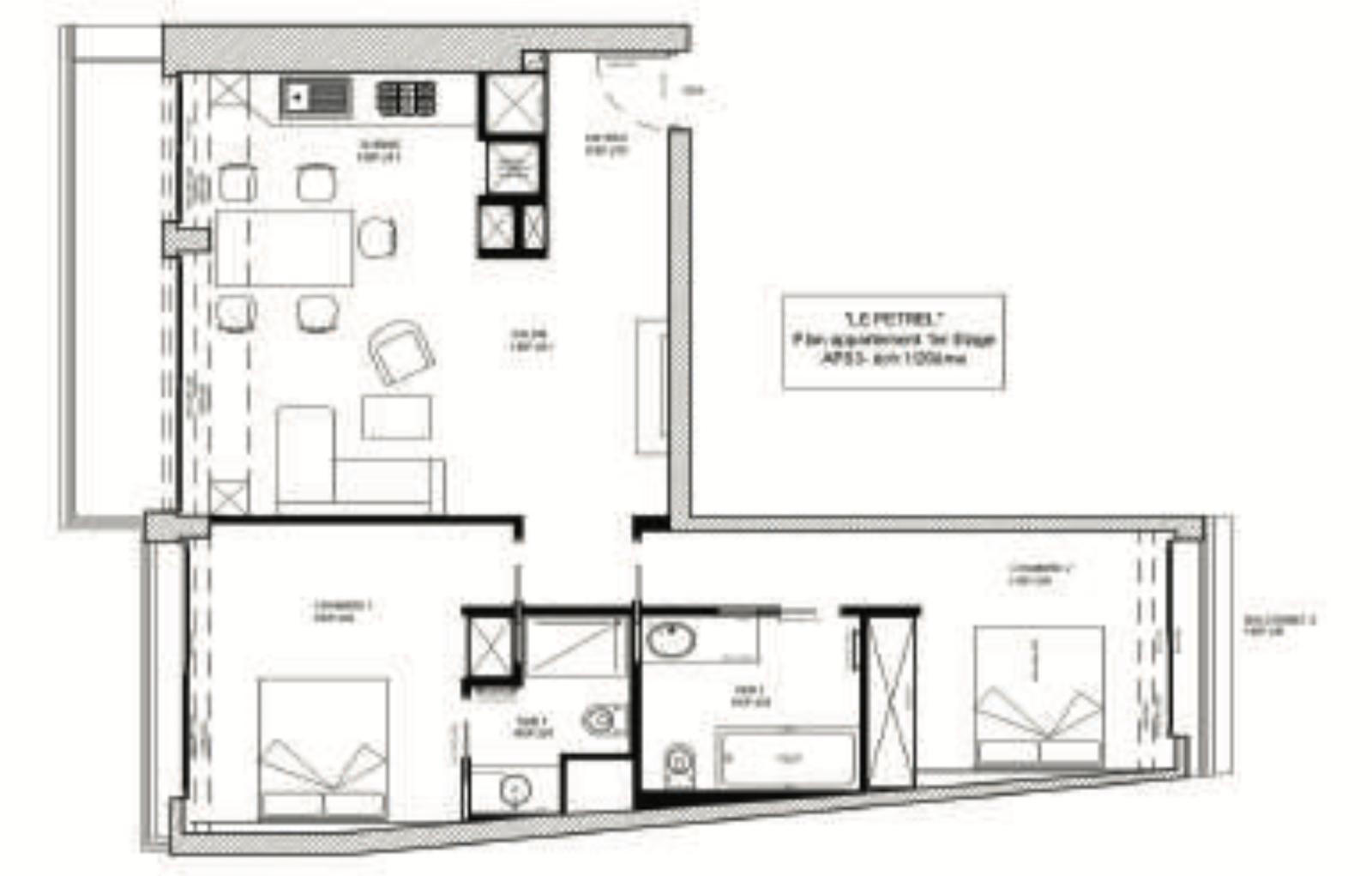 Il se compose d’un hall d’entrée, d’un salon et cuisine ouverte, avec terrasse, et de deux chambres et deux salles de bain avec terrasses également.