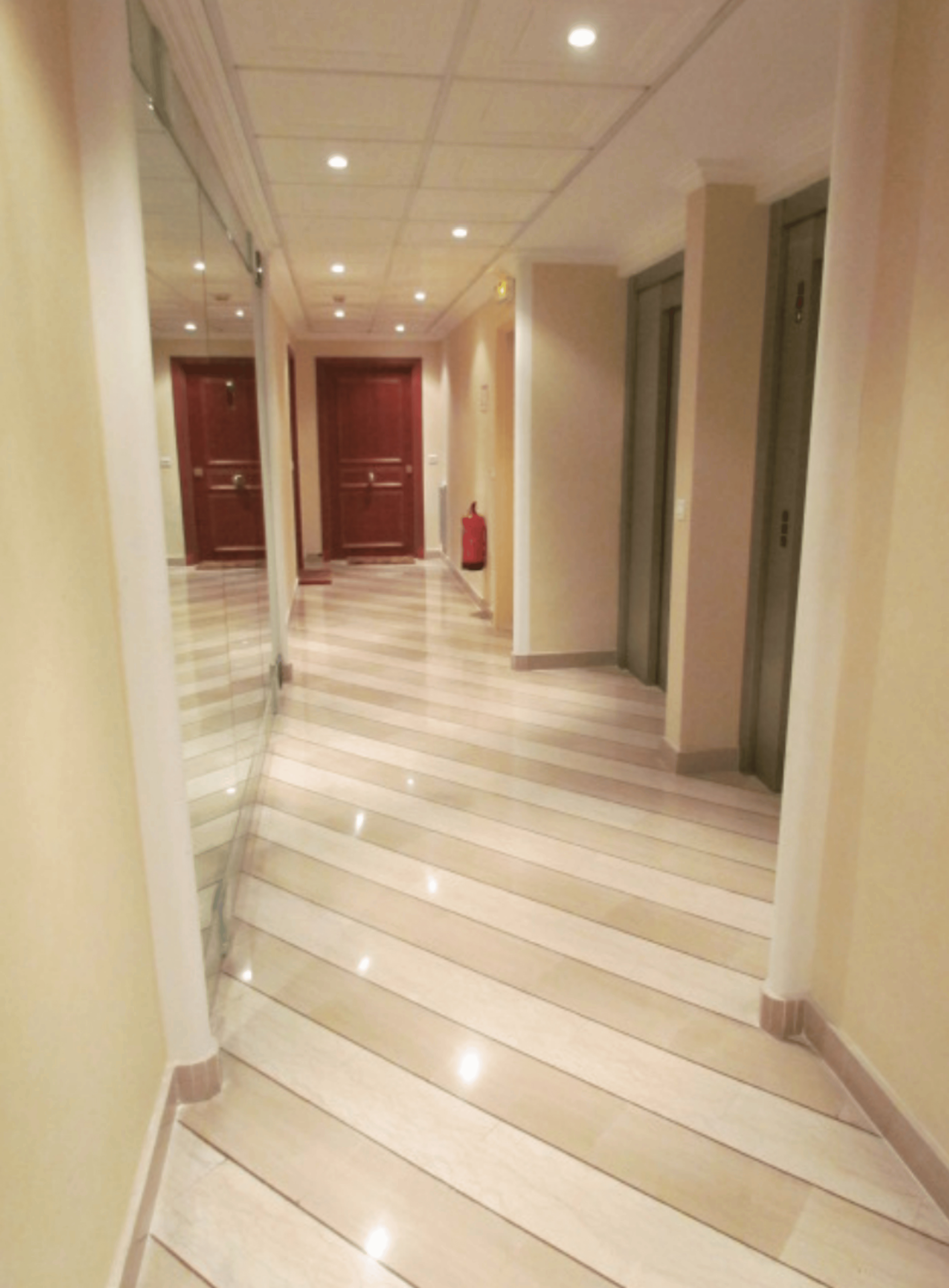 Le bureau, situé au premier étage et d’environ 147 mètres carrés, se compose comme suit :