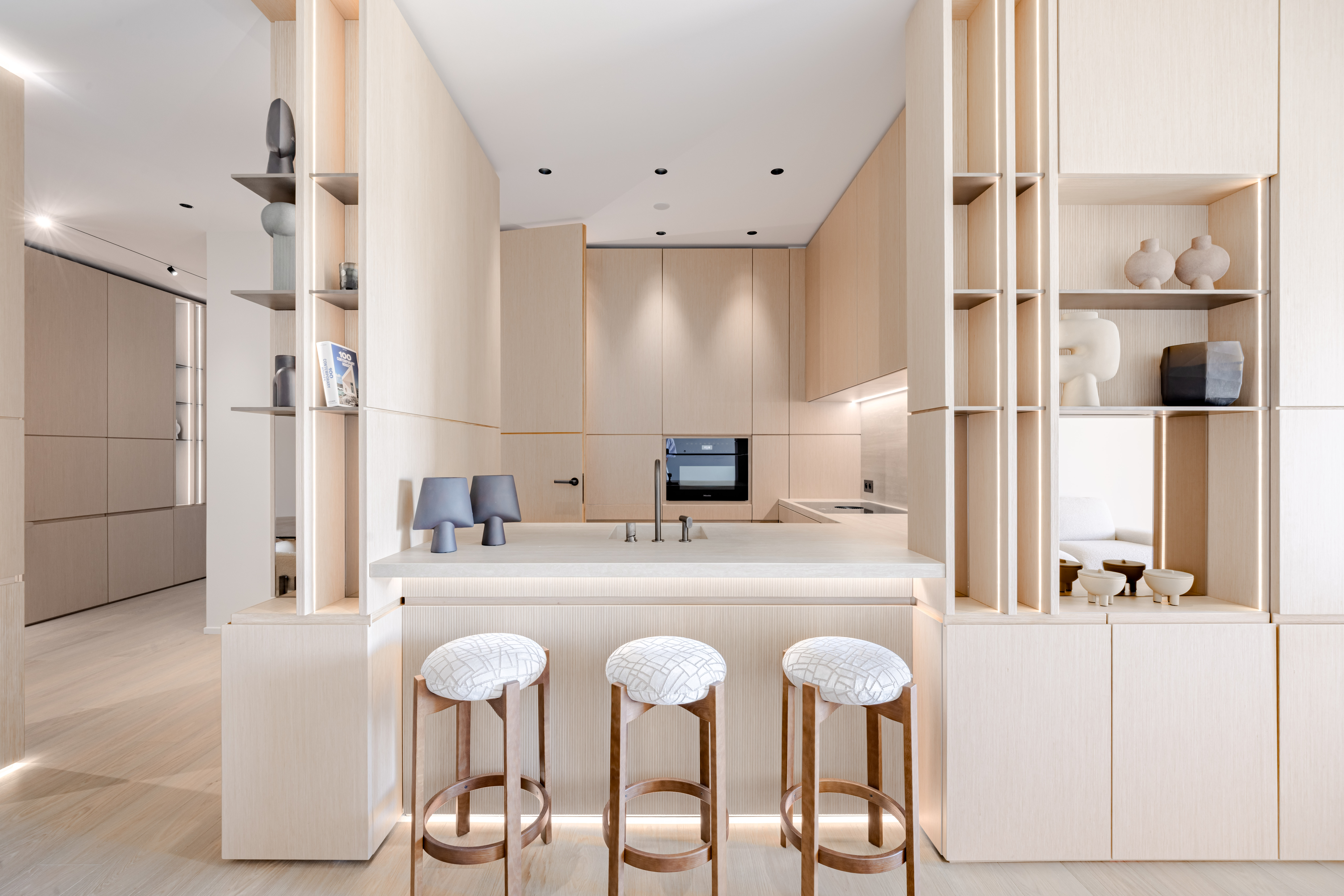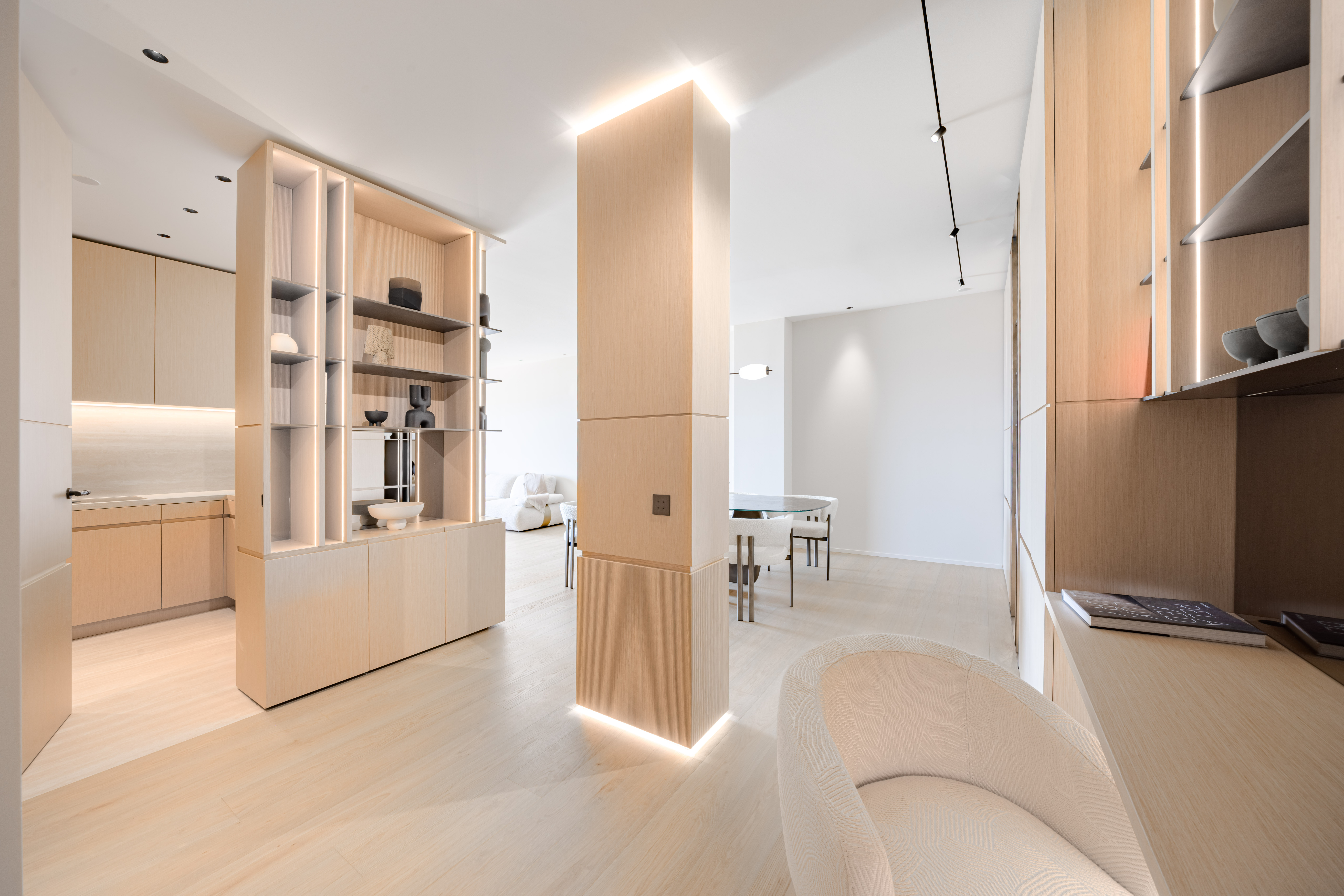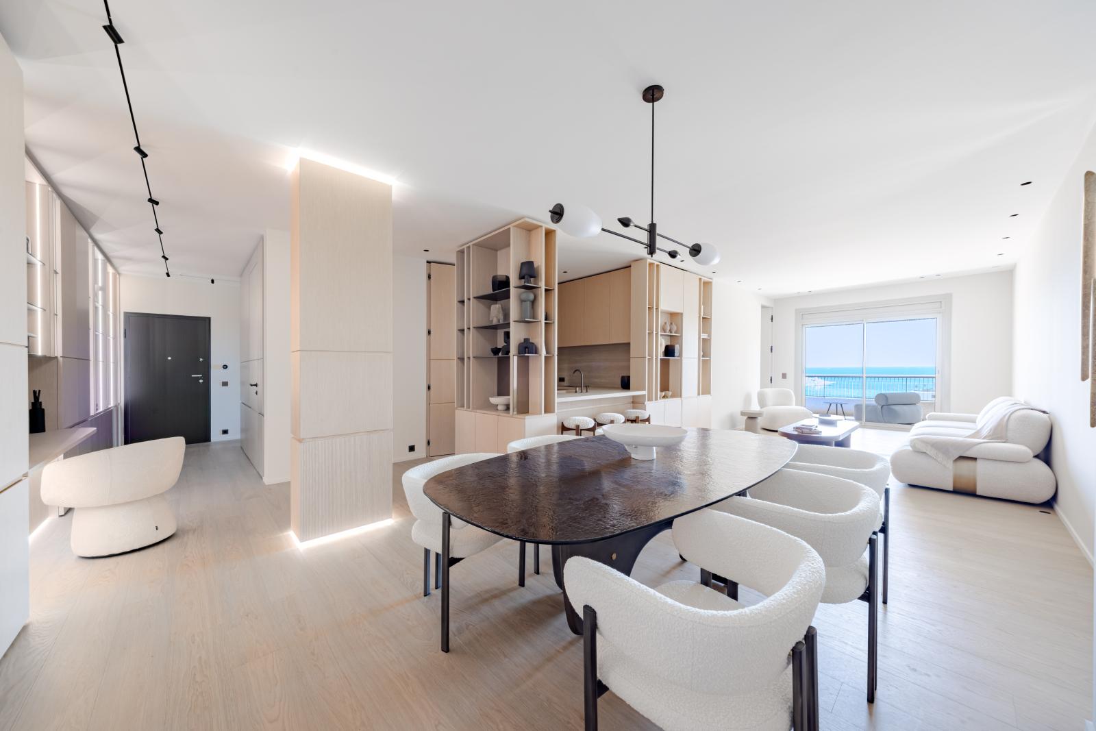 En étage élevé, cet appartement spacieux offre un grand séjour avec salle à manger, une cuisine semi-ouverte équipée haut de gamme, 2 chambres, 2 salles de bains et toilettes invités.