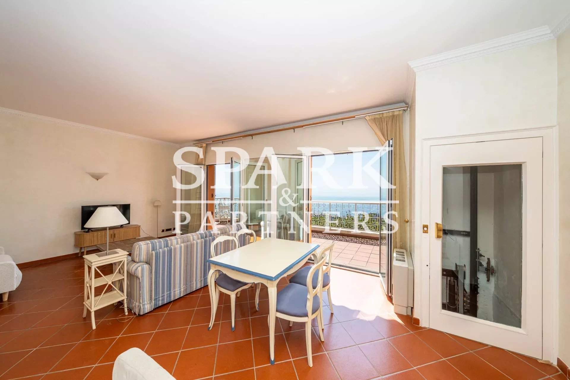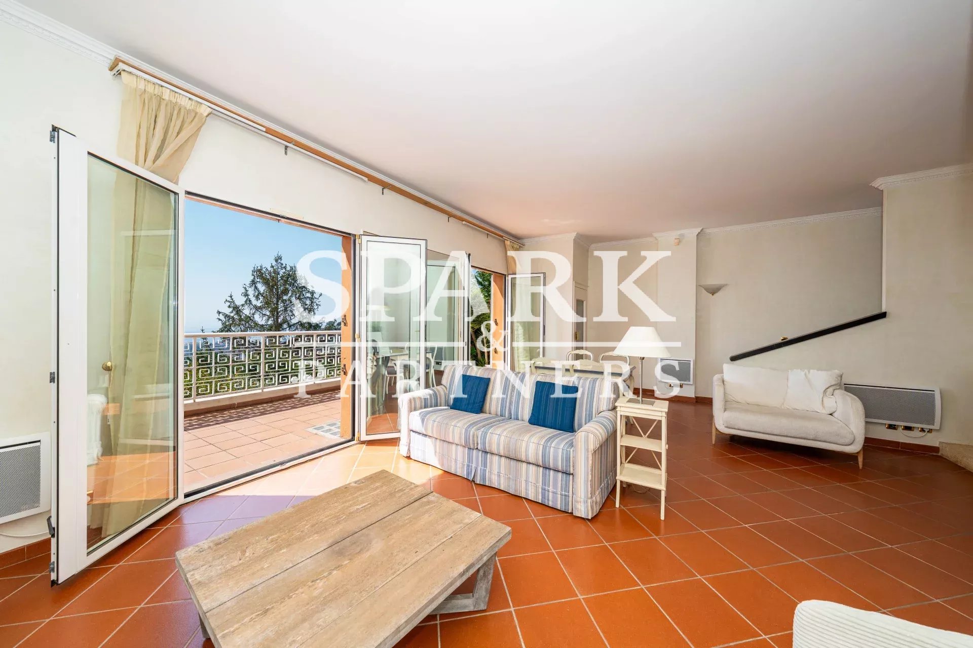 Édifiée sur trois niveaux et desservie par ascenseur, elle se compose d'un séjour, salle à manger avec cheminée ouvrant sur une terrasse vue mer, 3 chambres avec salles de bains, cuisine équipée indépendante.