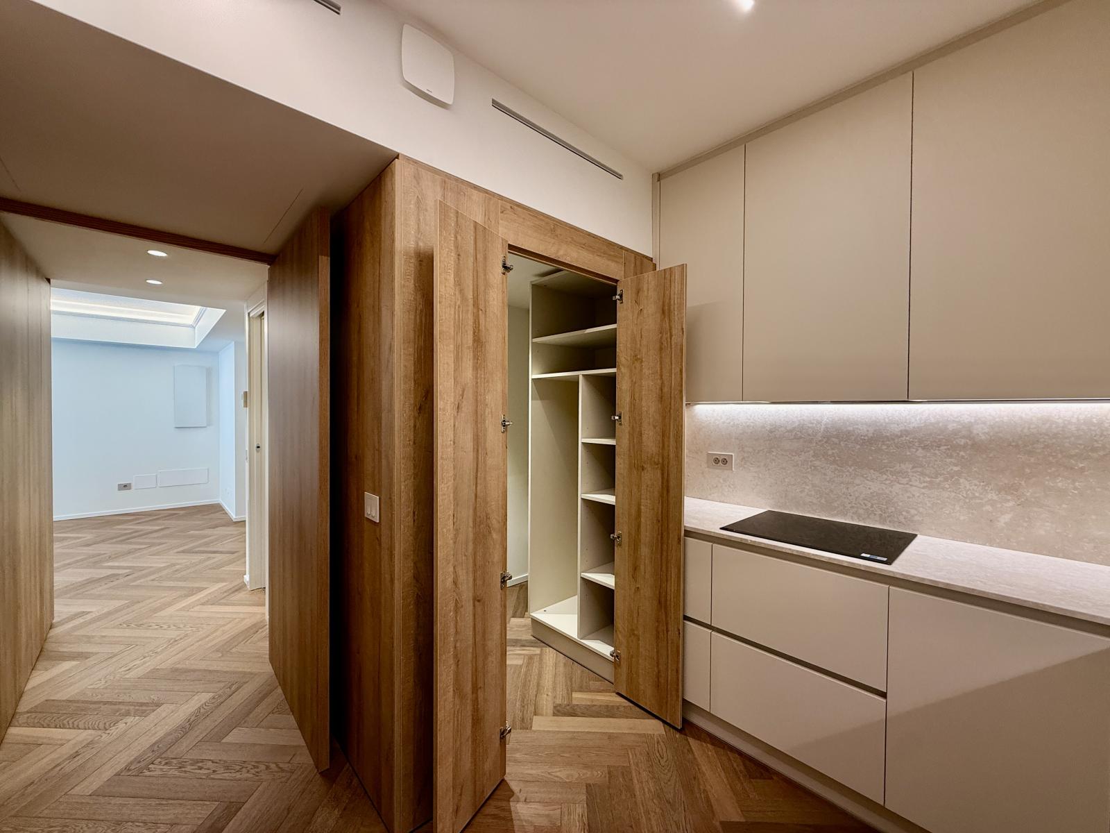 L’espace de vie se compose d’un vaste séjour lumineux, prolongé par une cuisine entièrement équipée, dotée d’un arrière-cuisine / cellier avec buanderie.
