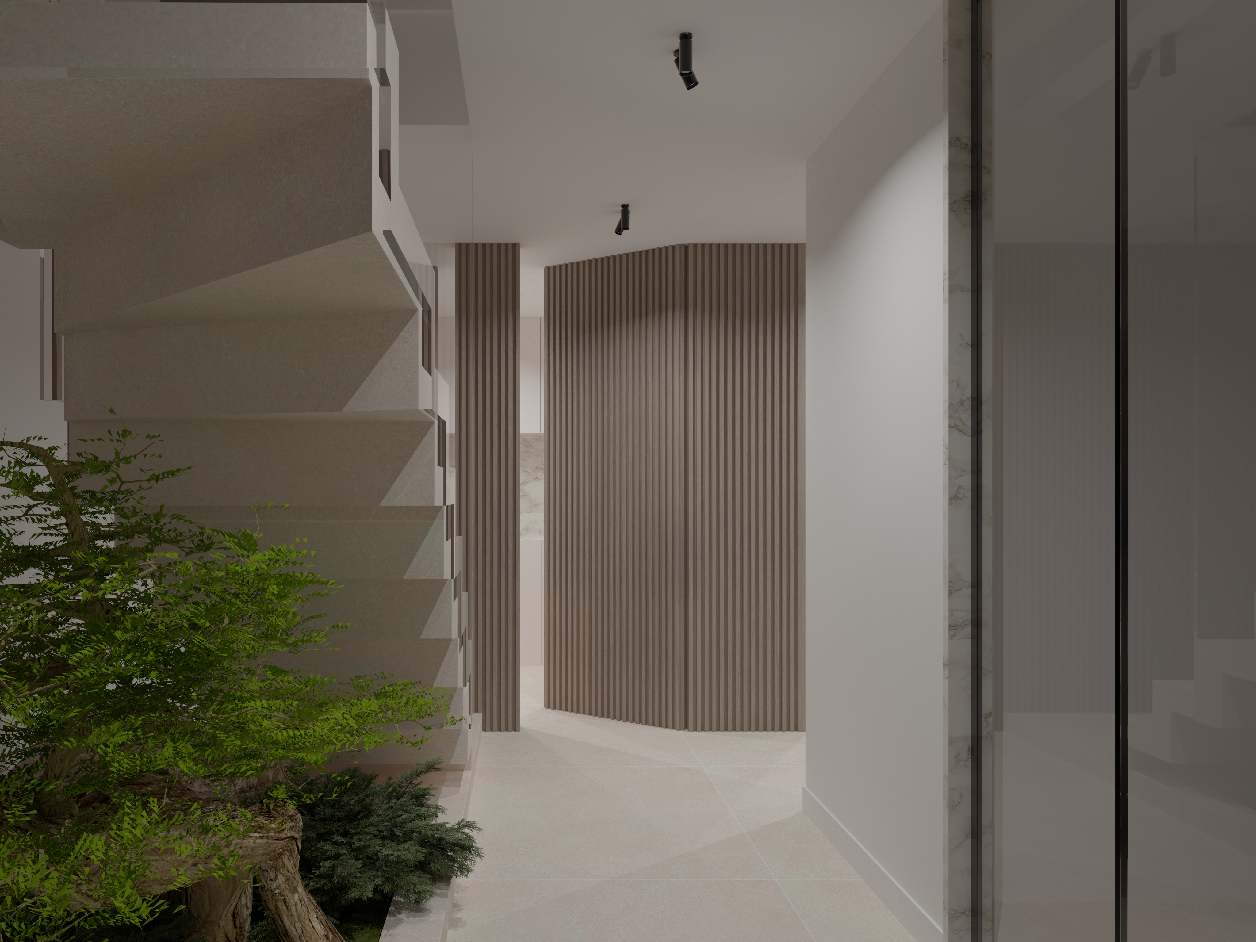 À l’étage intermédiaire, une vaste réception avec cuisine semi-ouverte, double salon et salle à manger s’ouvrira sur une immense terrasse avec piscine.