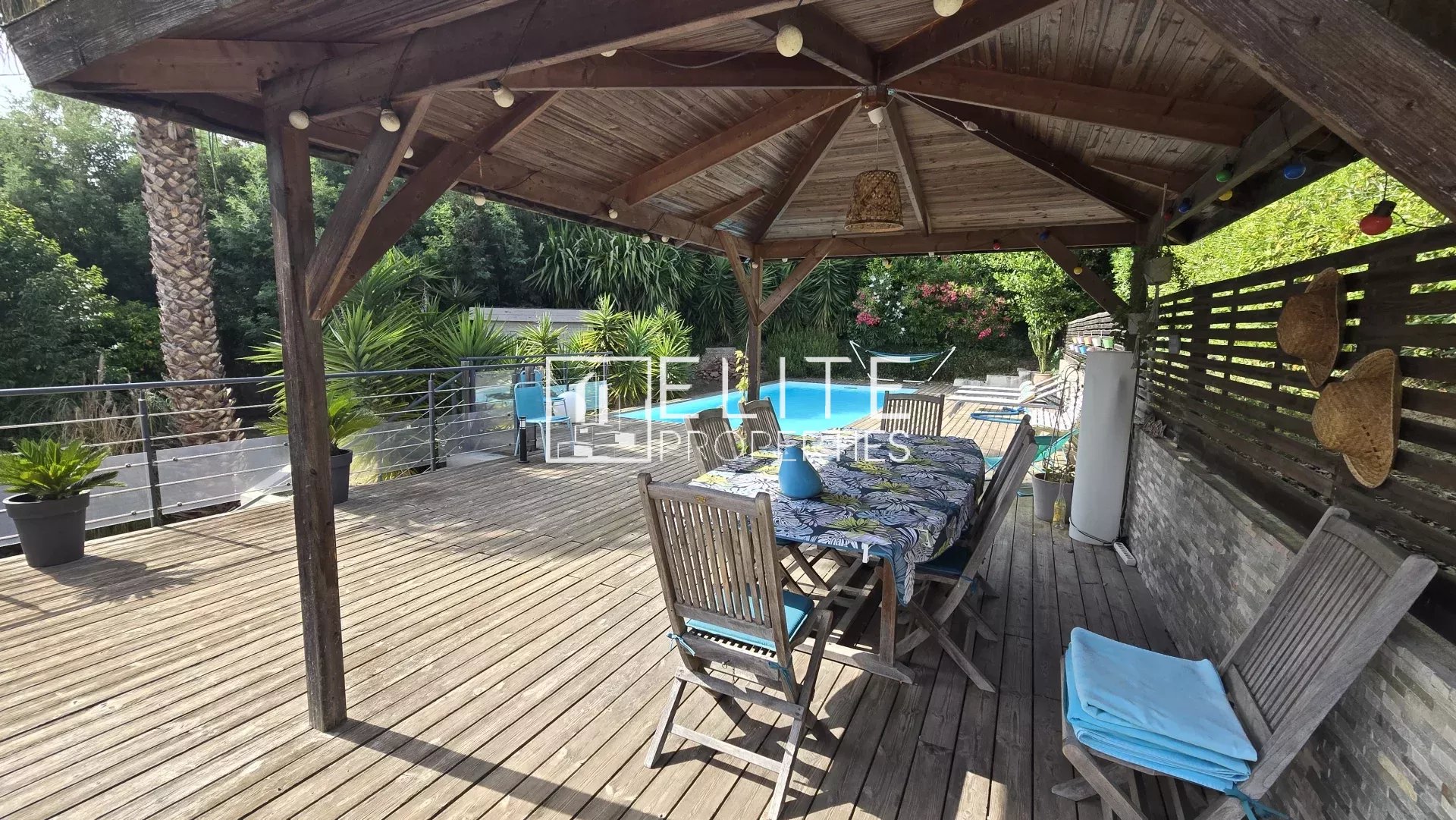 Prestations : climatisation réversible, pompe à chaleur, double vitrage, volets roulants et stores électriques, alarme, éclairage extérieur, portail électrique, fibre, tout à l'égout.